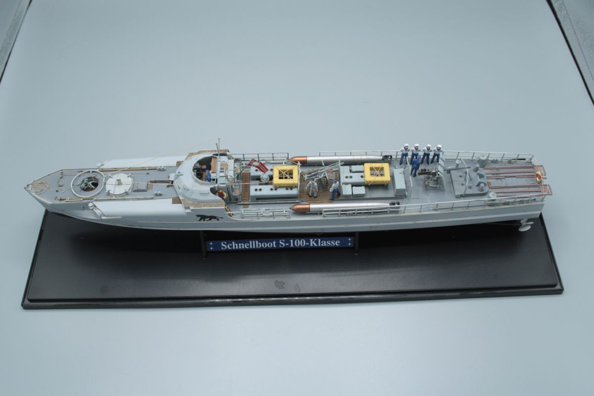 Das allseits bekannte Revell S100 Schnellboot ist out of the box entstanden und wurde nur mit ein paar Seeleuten, ebenfalls von Revell, aufgepeppt. Das ganze ruht staubfrei in einem Trumpeter Display.