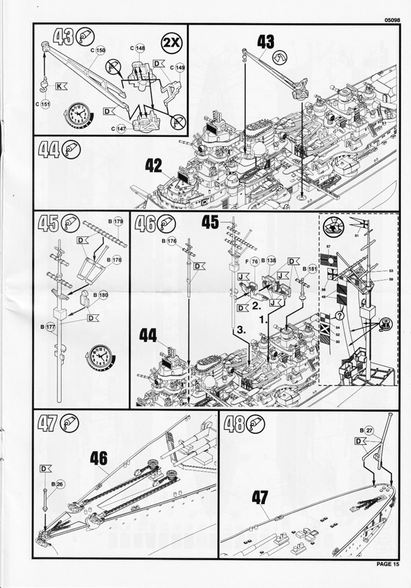 Abziehbilder sind lediglich als schwarze Streifen vorhanden (siehe auf der Seite mit den Farbangaben), um damit den Wasserpass darzustellen. Kriegs- und Vizeadmiralsflagge fehlen leider.