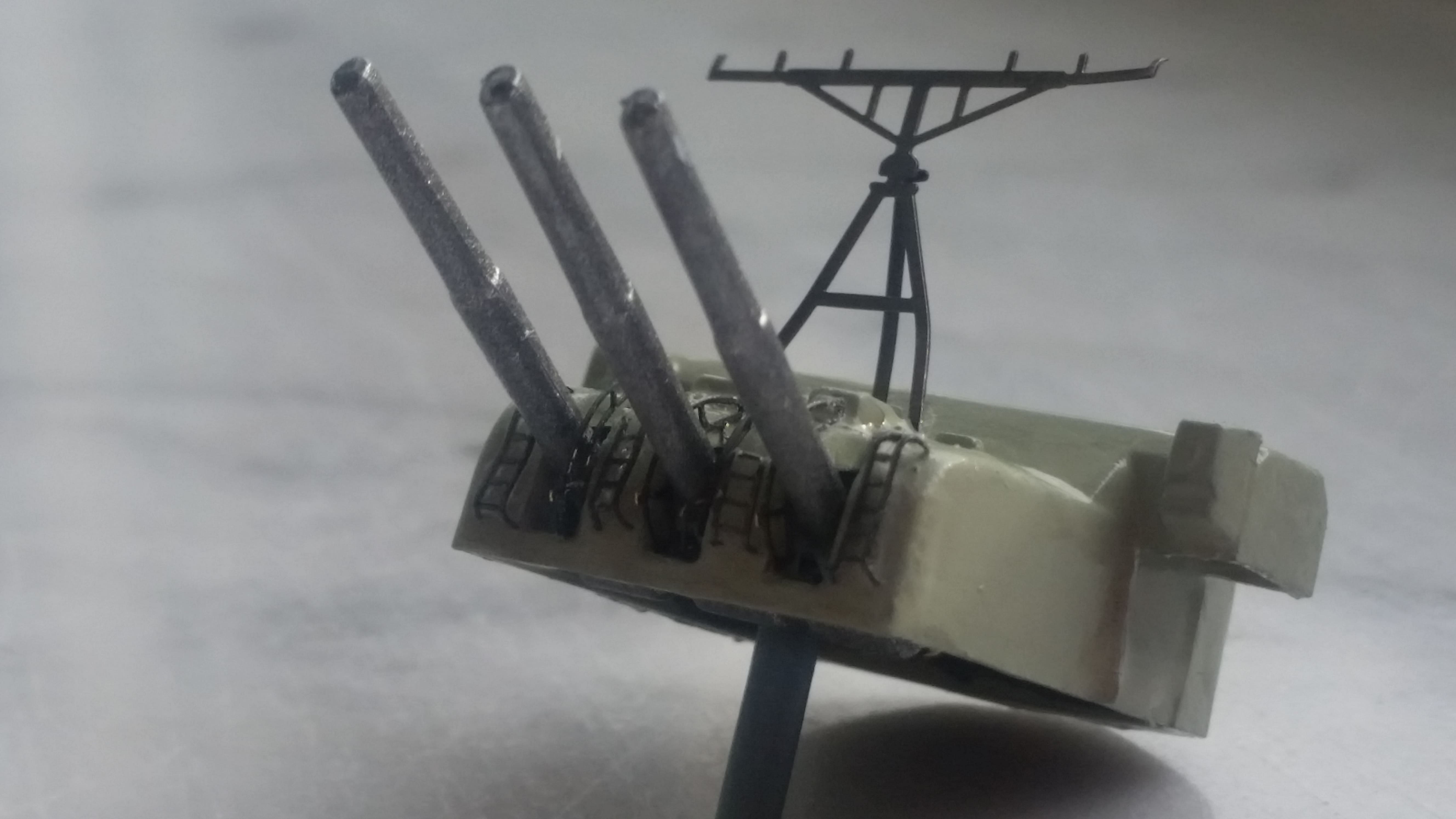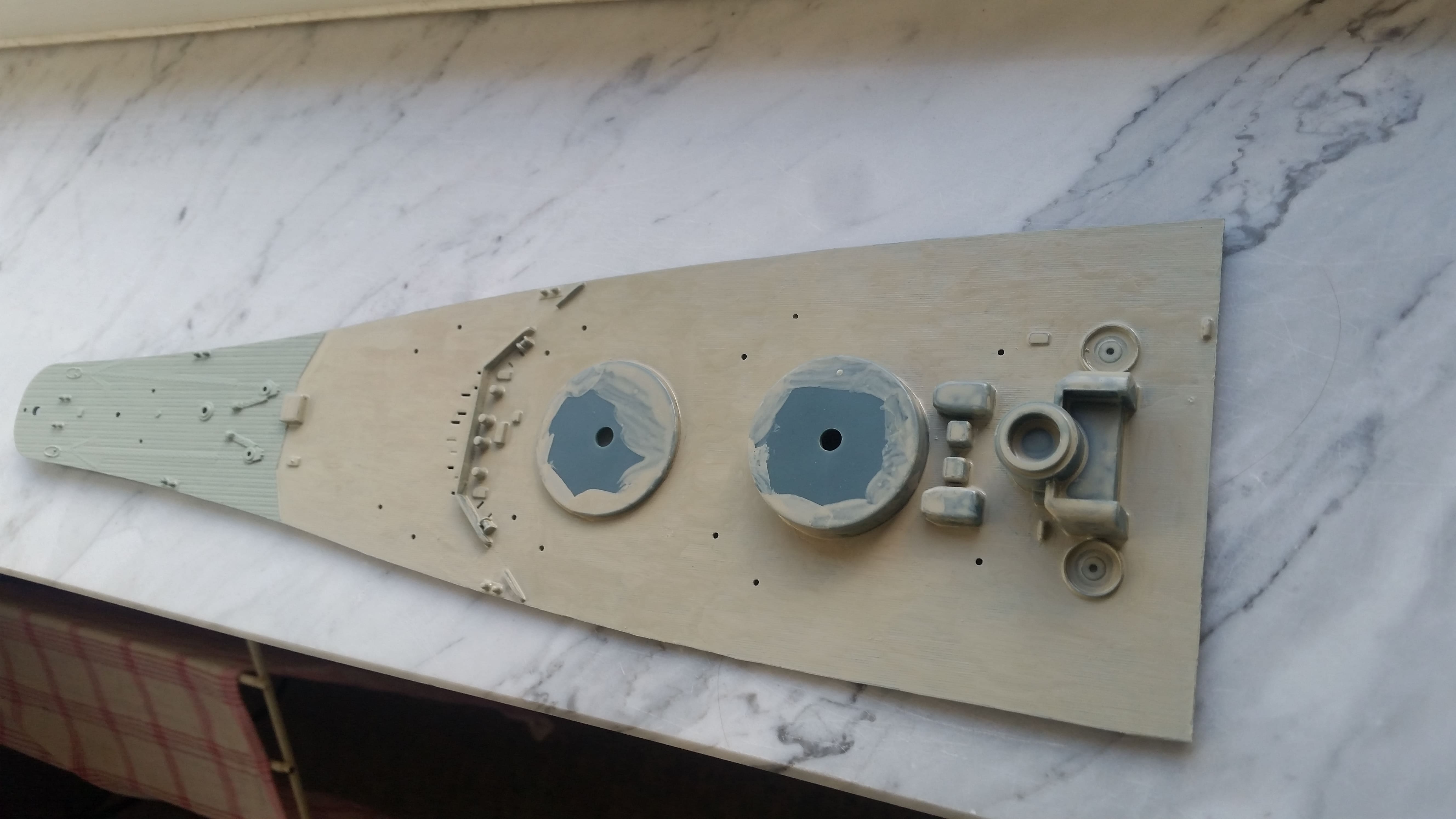 Es geht voran.Die 46 cm Geschütze sind montiert, ebenso das vordere 15,5 cm Geschütz und die vorderen Rollen mit kleinsten Ätzteilen.