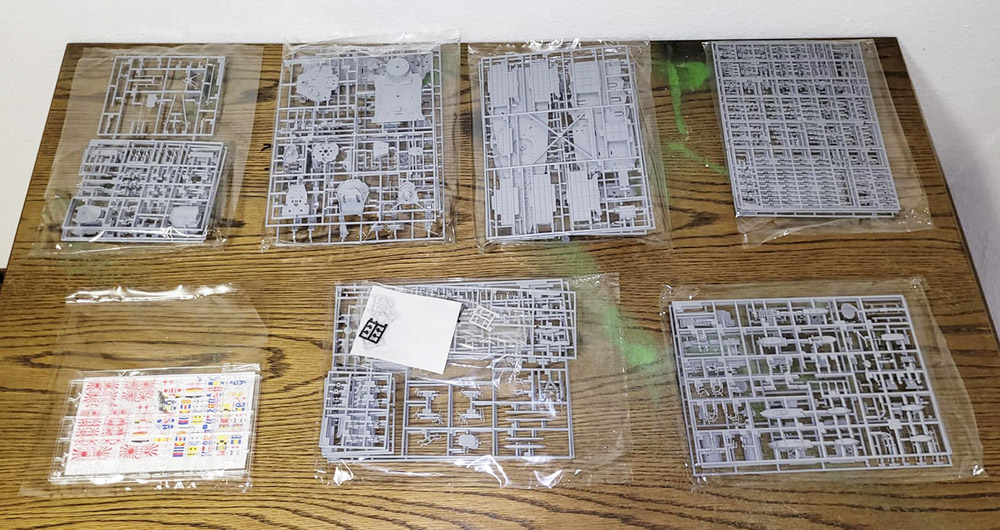 Die fast 850 Bauteile verteilen sich auf 31 Gussäste, die wiederum in sieben Tüten verpackt sind. Ich glaube nicht, dass ich jetzt jede Tüte einzeln aufmachen und abfotografieren muss. Der Großteil der Bauteile ist im Standard-Grau gehalten, ein paar Klarsichtteile sind auch dabei und auch ganz wenige schwarze Teile. Wofür die dann sind, wird sich dann beim Bau zeigen.