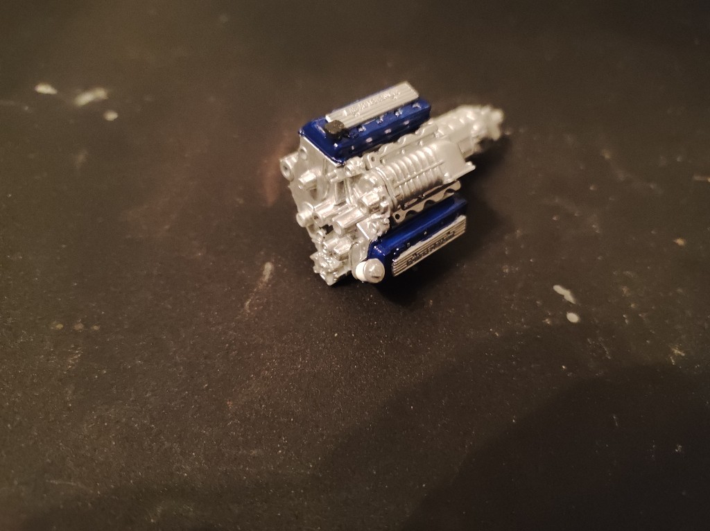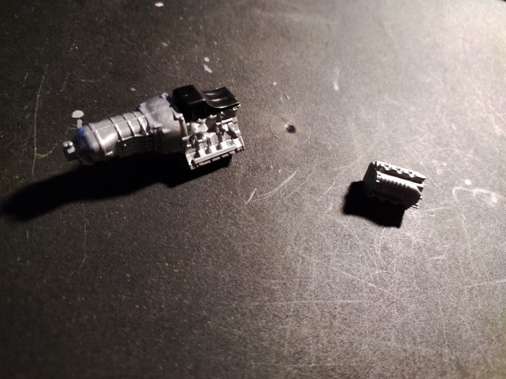 Ganz klassisch habe ich den Motorblock und Getriebe einfach erstmal zusammengesetzt, der kleine Kasten ist vermutlich der Kompressor, der insbesondere beim Shelby vorhanden ist.