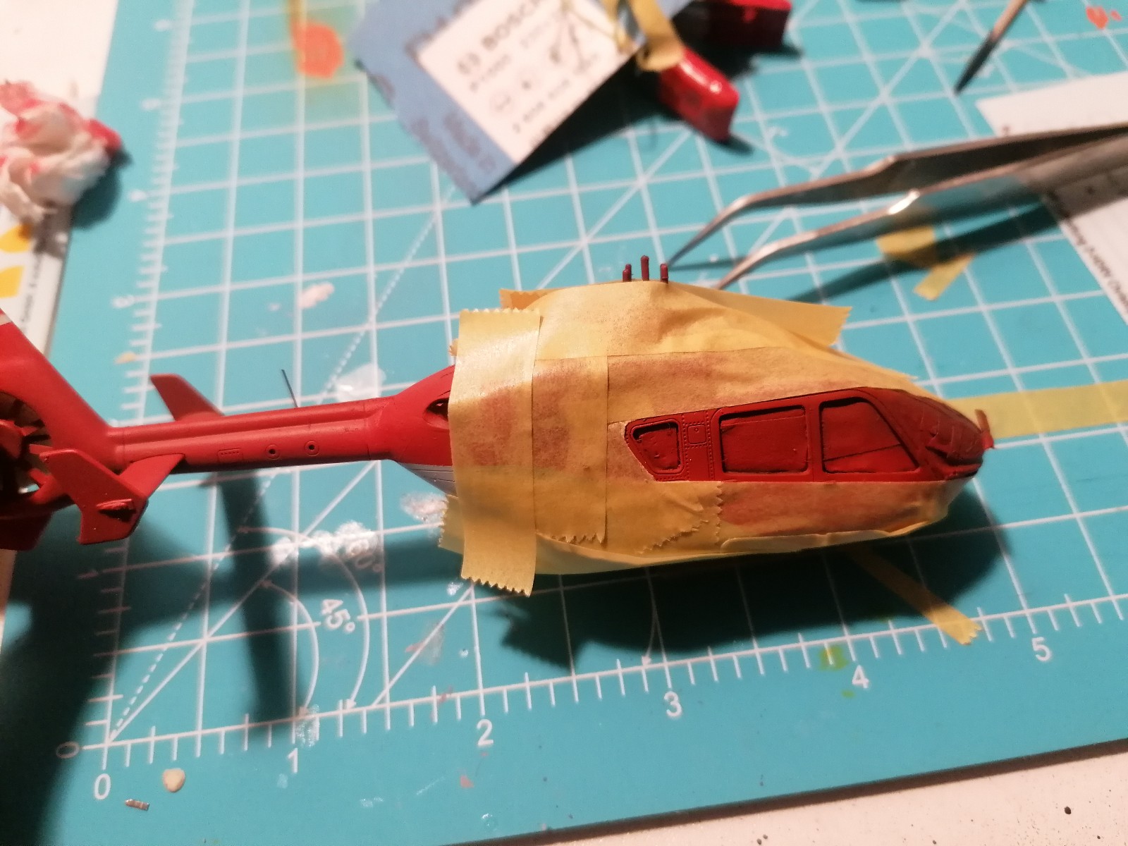Nach dem die Grundierung getrocknet war, wurde das Modell in Weiß lackiert. Anschließend maskiert und mit rot lackiert. Die Prozedur habe ich zweimal gemacht, da mir das erste Ergebnis farblich nicht überzeugt hat und ich beim abkleben etwas unsauber gearbeitet habe. Der zweite Versuch gefällt mir deutlich besser.