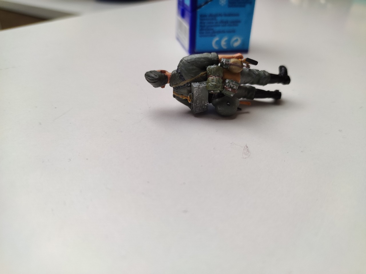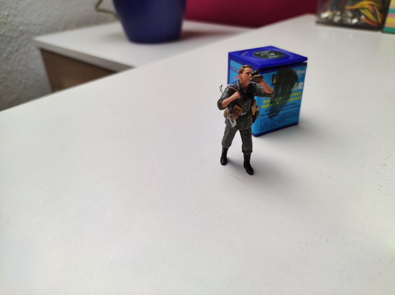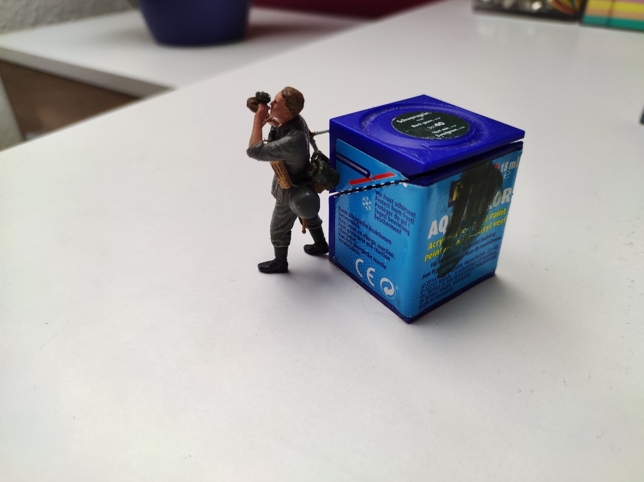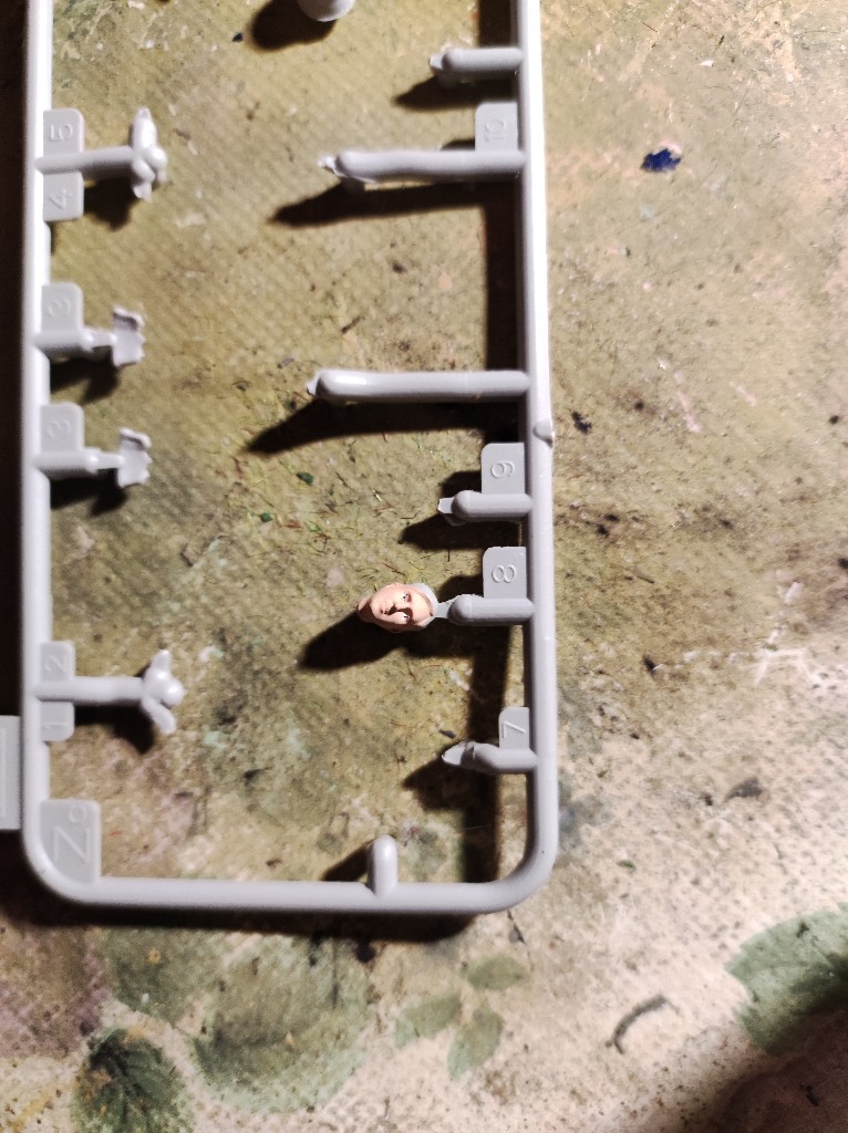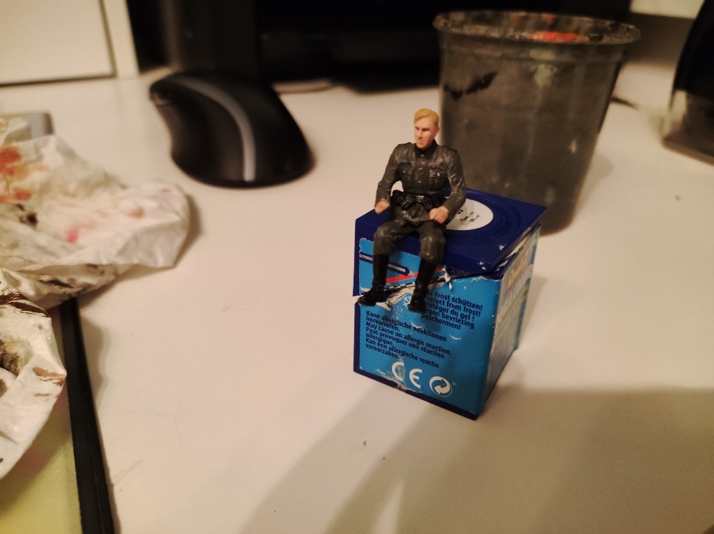 Dann beides zusammengefügt und die Haare gemacht, hier mit Afrikabraun als Grundton, dann mit Ocker, Sand, Gelb, braun und Grau trocken gemalt. Die Decals für die Uniform waren einfach unbrauchbar... Viel zu dick und haben nicht gehalten bzw konnte man nicht Mal mit verdünner an die Figur anpassen... Achja sie waren auch brüchig...