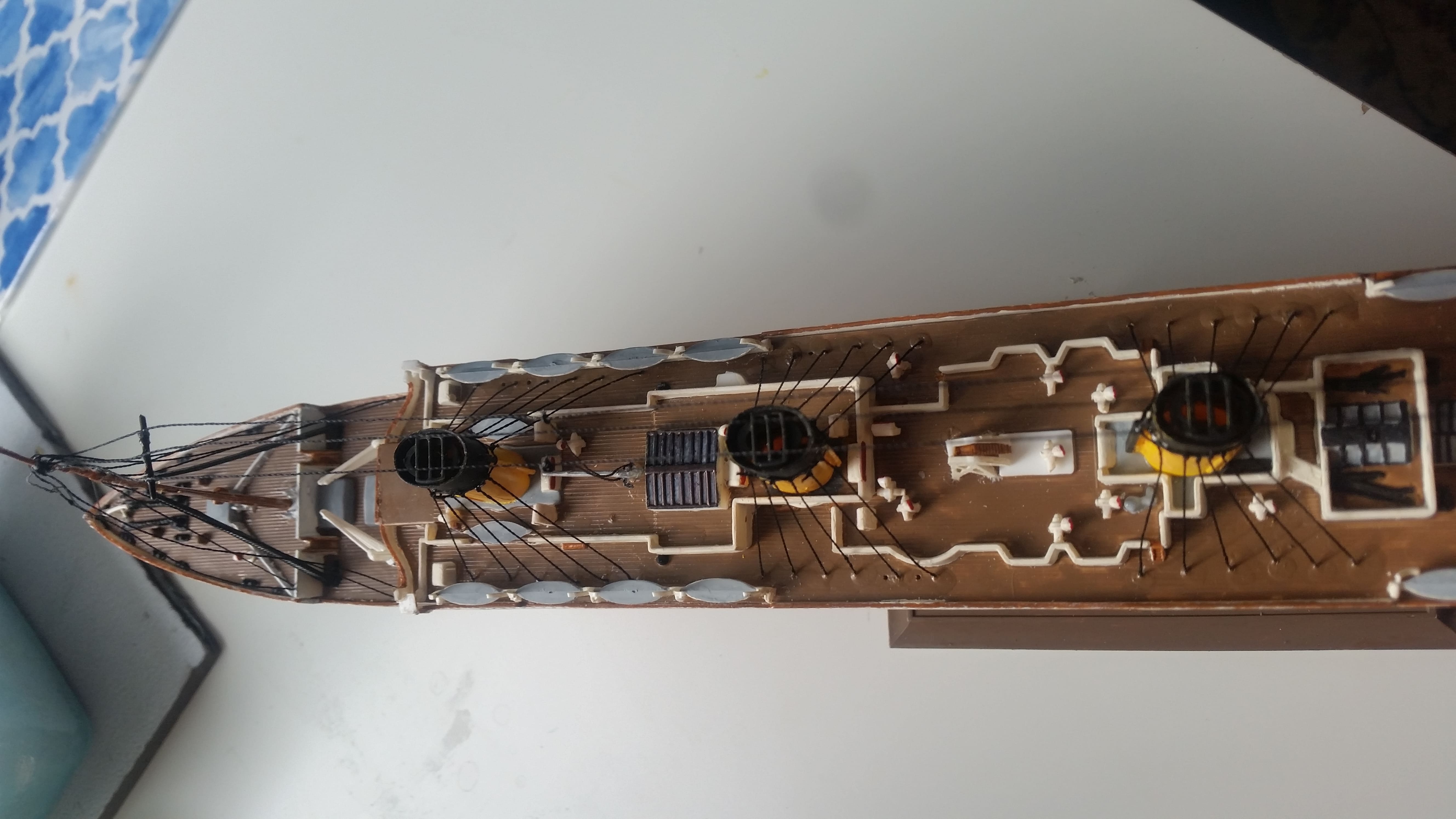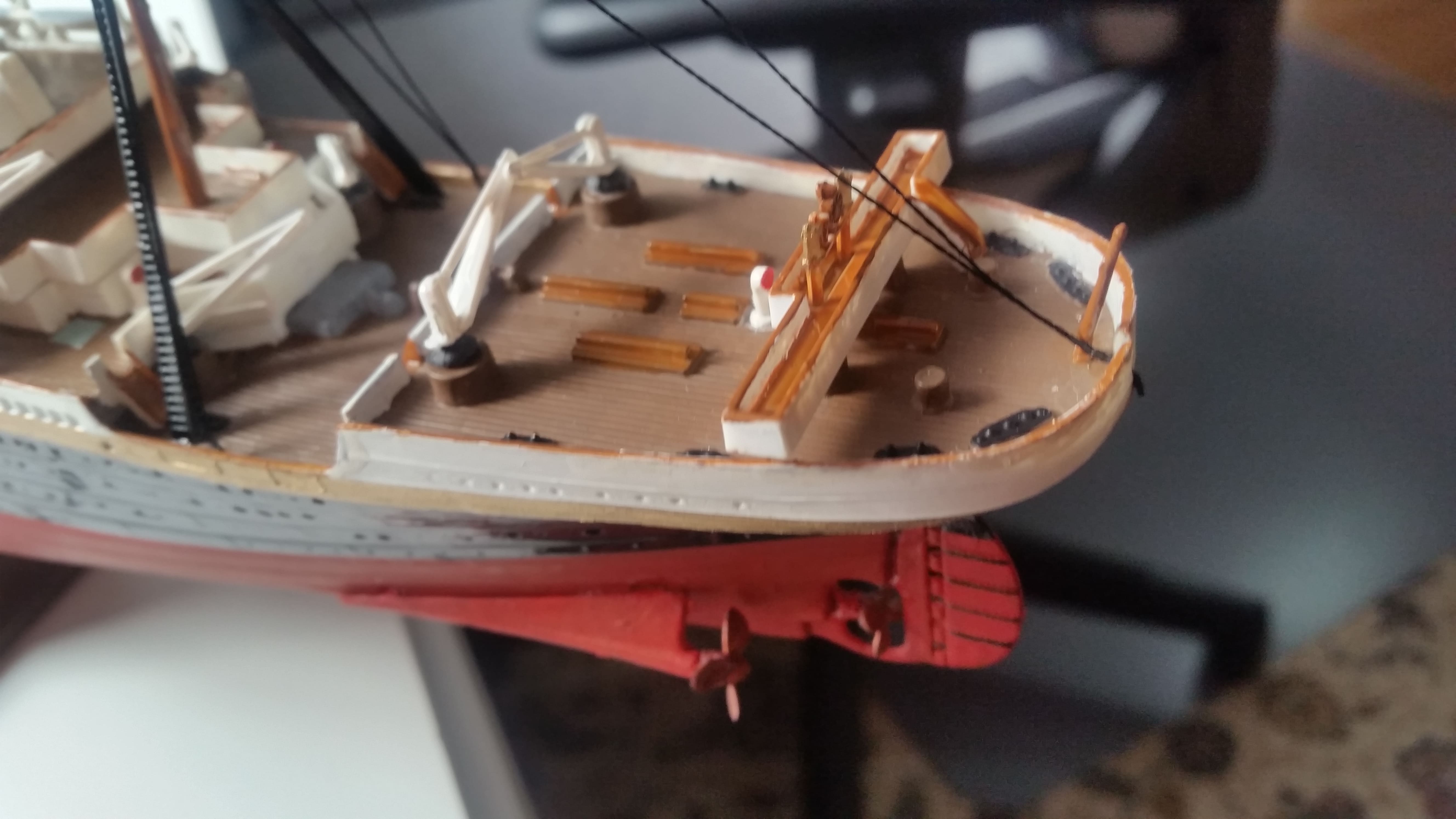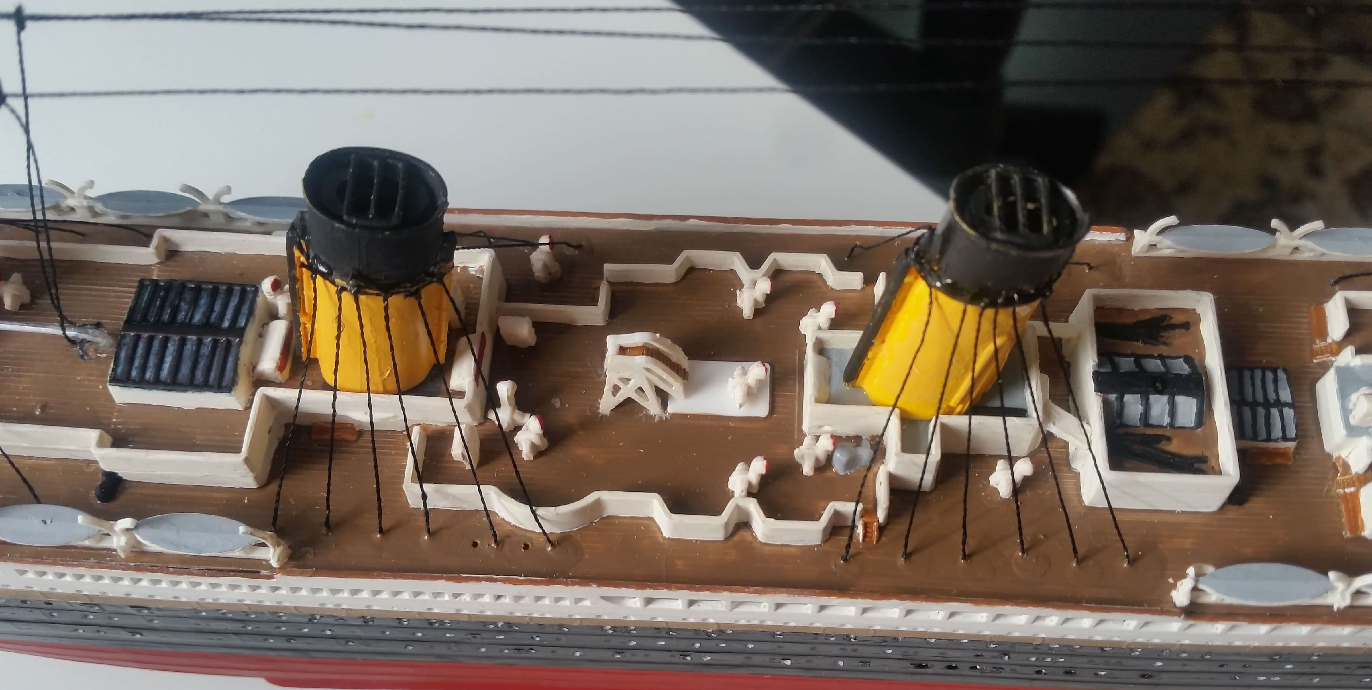 alle Decks passten haargenau. Nur das oberste Deck mit den zwei vorderen Schornsteinen war etwas zu lang geraten und musste eingekürzt werden. Da ich jetzt mehr Zeit für das Modell hatte habe ich mich etwas mehr um die Details gekümmert. Hier mal ein paar Bilder.[