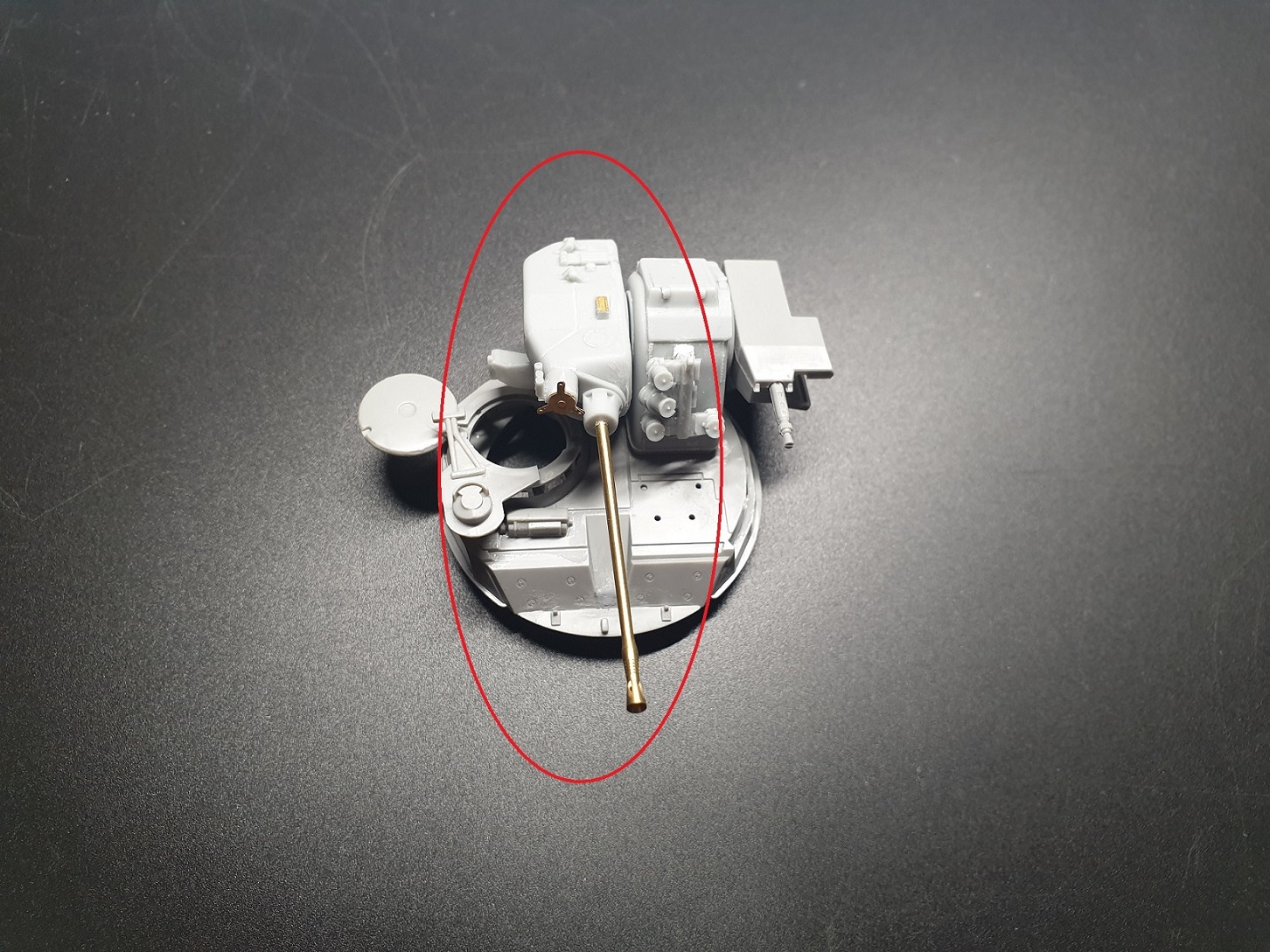 Der rot eingekreiste Teil des Panzerturm A3 ist aus dem Upgrade Kit und wurde auf die Basis des Revell Modellbausatzes verklebt. Hier muss man leider sagen das viele Teile vom Upgrade Kit nicht zu gebrauchen sind. Entweder sind Fehler in der Produktion vorhanden oder der Detailgrad stimmt nicht und sieht beim Modellbausatz von Revell einfach besser aus. Da werde ich euch nächste Woche mal ein paar Beispiele zeigen. Es ist ein wenig ärgerlich bei dem Preis.
