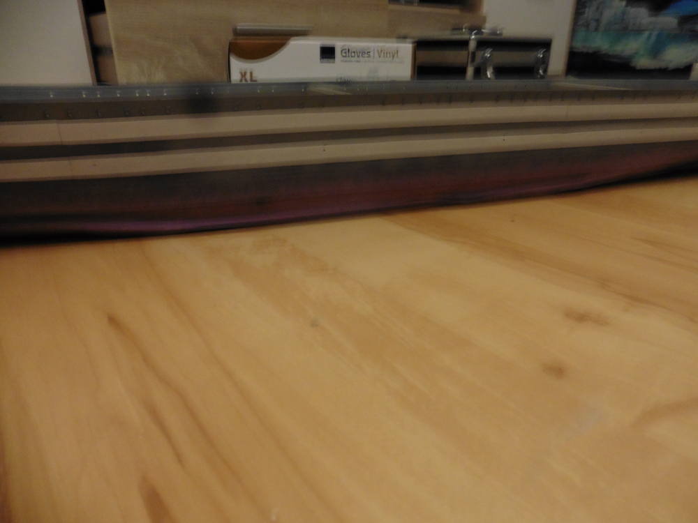 Hier habe ich erst die Höhen mit meinen Gestell / Bleistifttrick auf den Rumpf gezeichnet . An Bug und Heck ( ab da wo der Streifen dann aus der Linie läuft . Habe ich mit Klarsichtfolie die Konturen des Strichs übernommen . Das Ganze dann auf die DIN A 4 Platten gelegt und mit einem Scharfen Skalpell ausgeschnitten . Das Ganze dann am Heck wiederholen , aufkleben , fertig . Ist relativ einfach zu schaffen . .