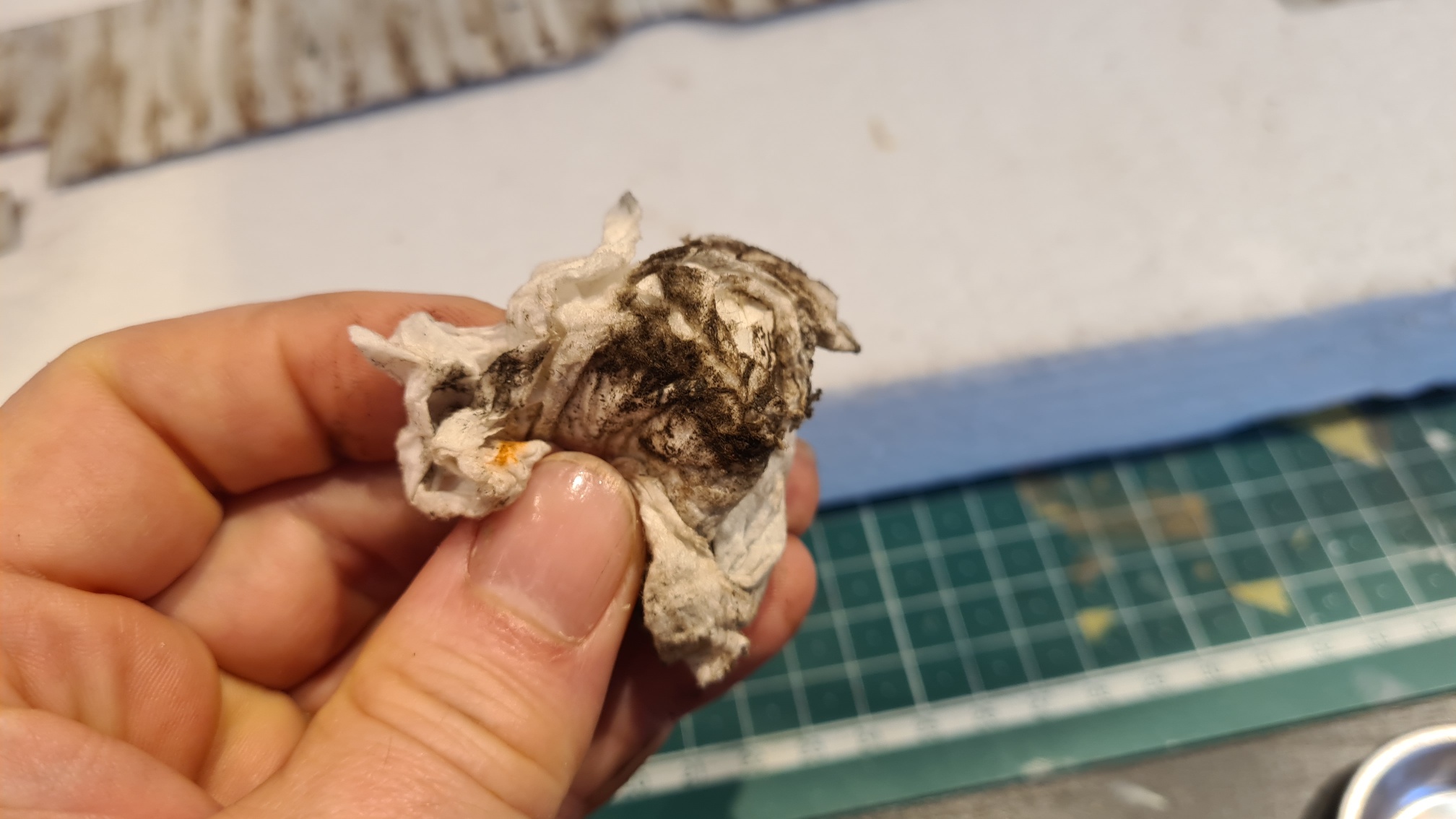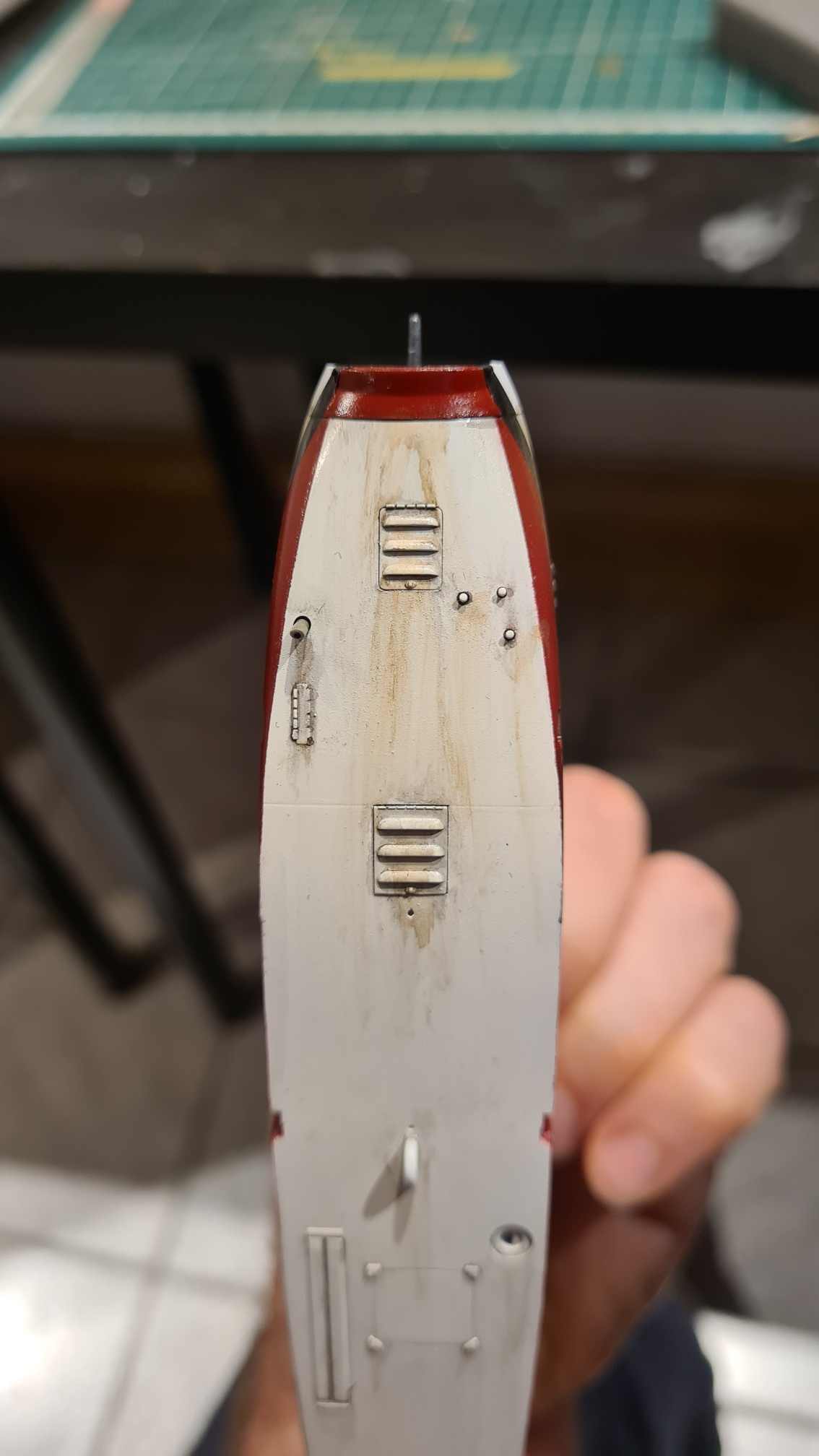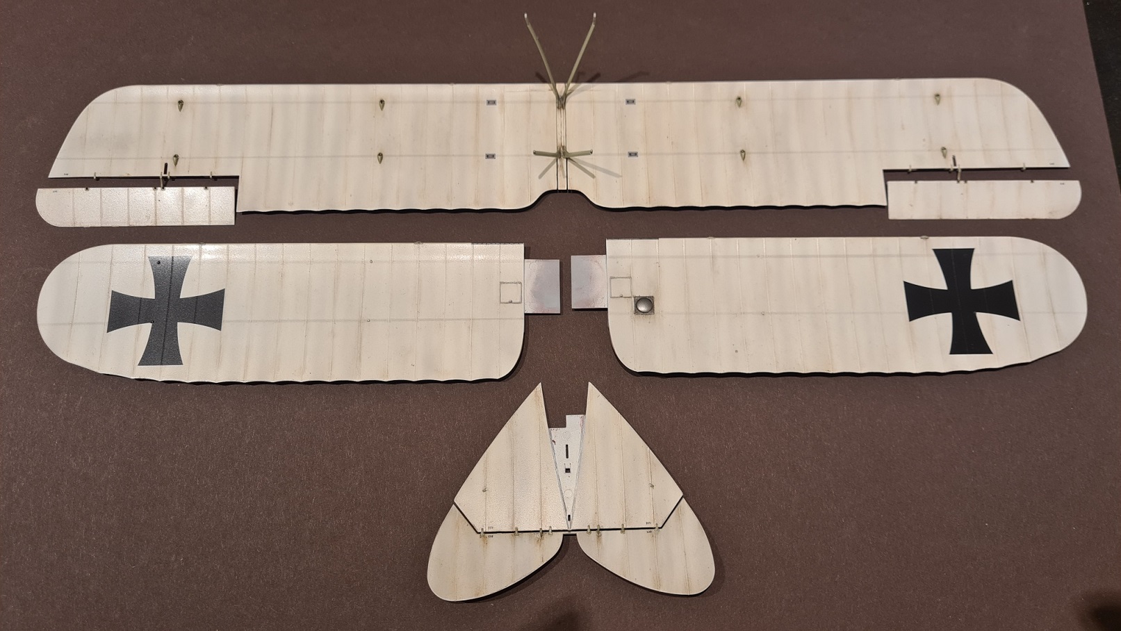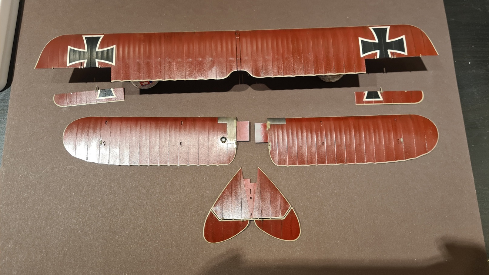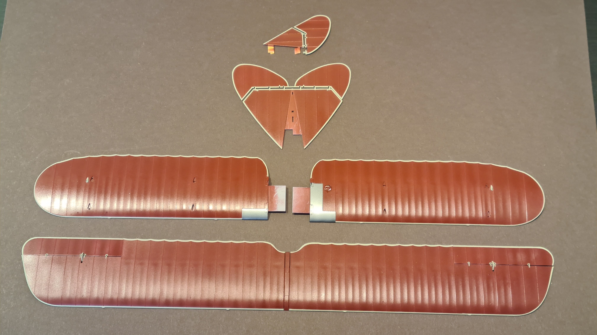 Dann wurde an den Tragflächen mit Ölfarbe rumgesaut, immer mit einer Mischung aus Braun und Schwarz: