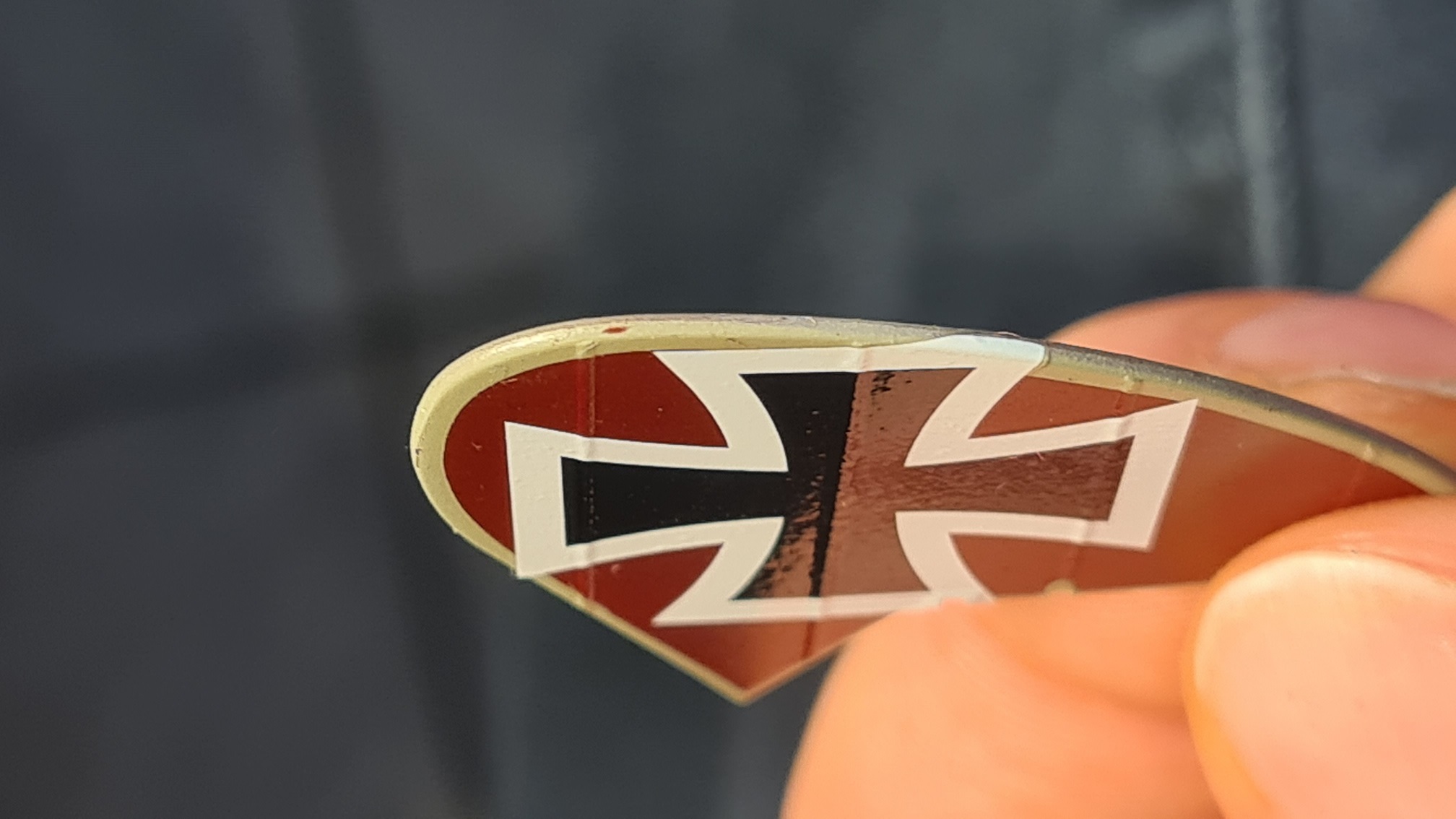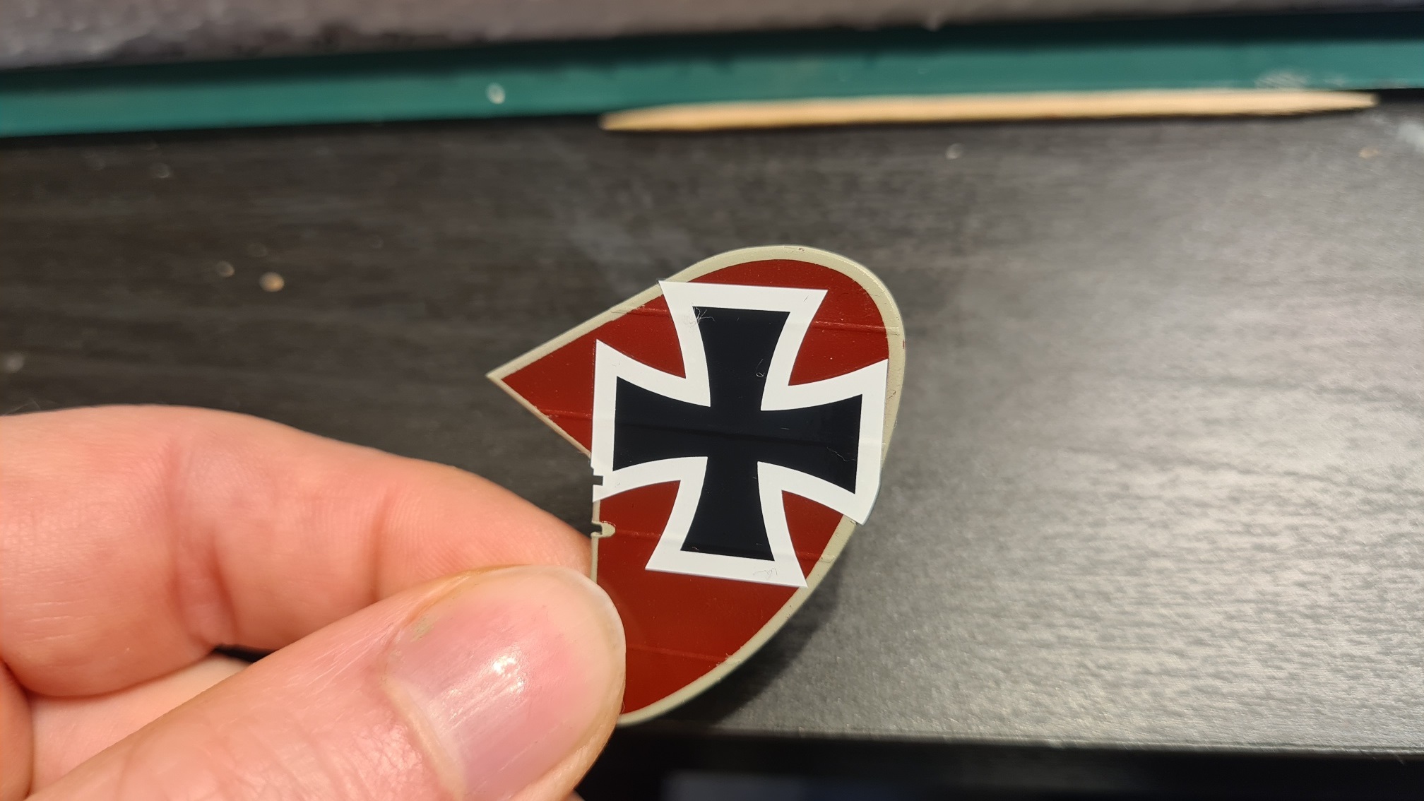 An vielen Stellen hat das mit dem "nur Wasser" ganz gut funktioniert. An genauso vielen Stellen aber auch nicht. In dem Moment in dem ich mit Glanzlack versiegeln wollte, haben sich die Decals wieder abgelöst / haben sich Blasen gebildet. Insbesondere ist das ärgerlich bei den großflächigen Decals auf den Tragflächenoberseiten aufgefallen. Der Frust war groß, die Reparatur hat lange gedauert. Mit extrem dünner Nadel wurde unzählige Male durch die Lackschicht und durch das Decal gestochen. Auf die Fläche wurde MrMark Setter gepinselt und mit einem Zahstocher auf die Blasen gedrückt. Die haben sich dann mit Setter vollgesogen. Nochmal andrücken (Setter rausdrücken) und das Decal klebte dann (an dieser einen Stelle).