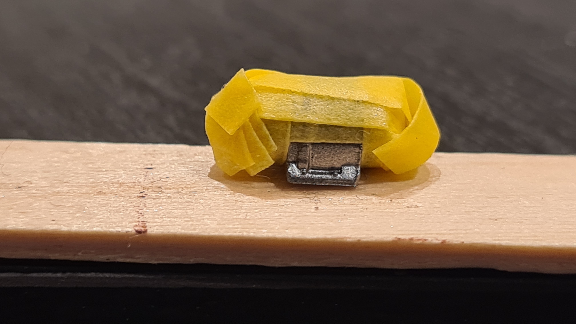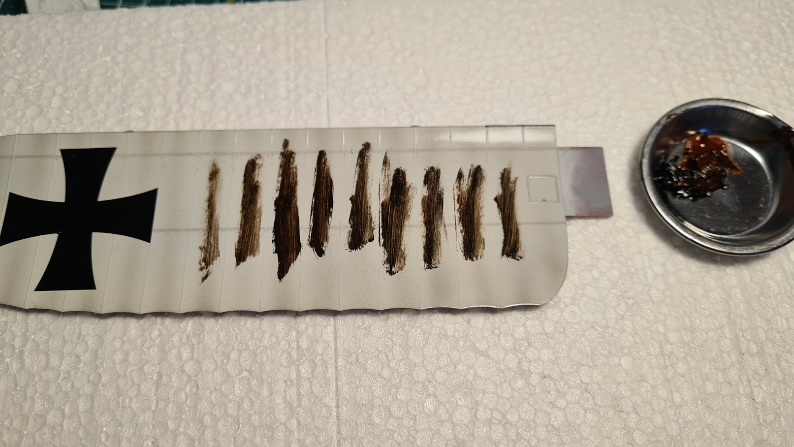 Ist der Föhn zu heiß, wirde die Glanzlackschicht darunter (in meinem Fall Tamiya TS13) wieder etwas weich. Das kann ziemlich in die Hose gehen.