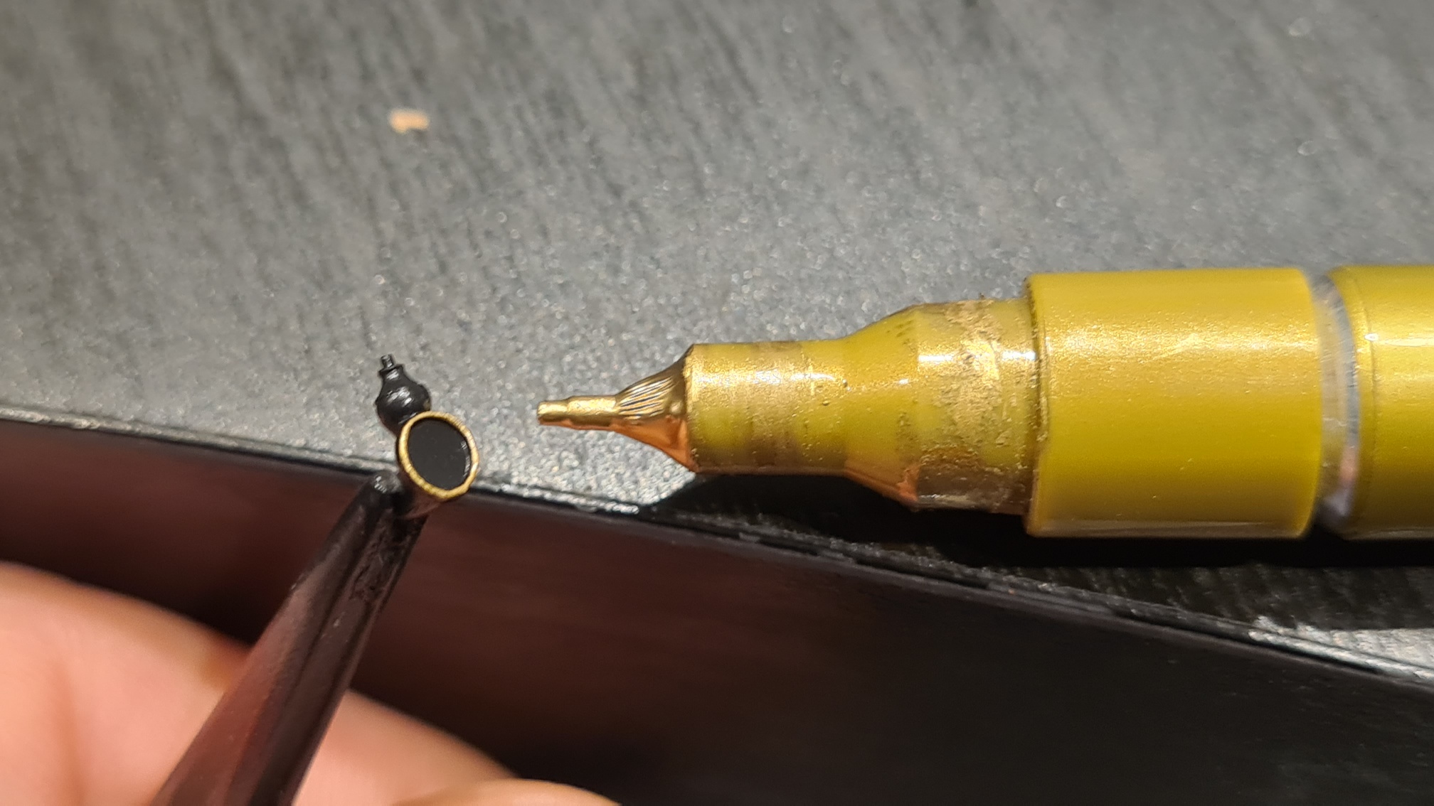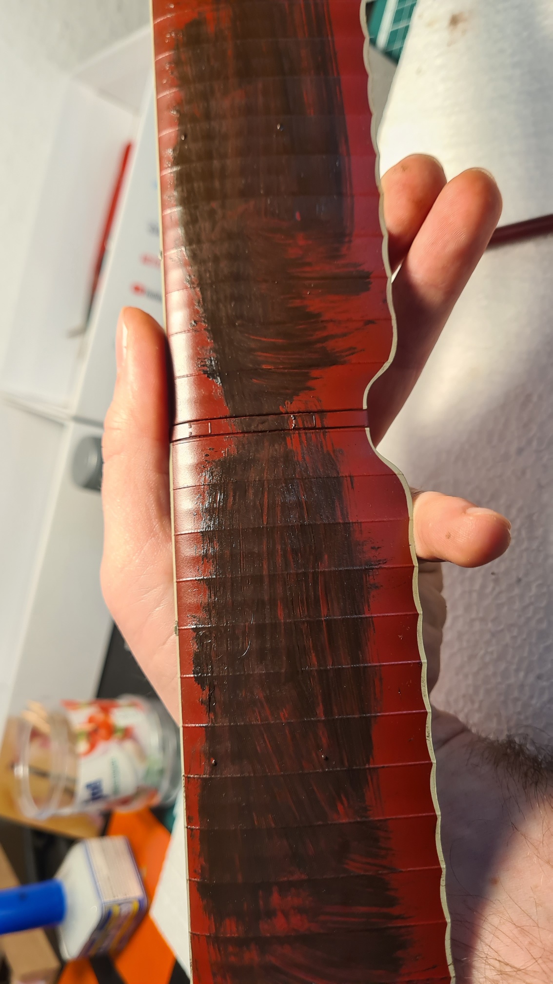 Das ist fast sofort trocken und es kam eine Schicht aus Clear Orange (10 Tropfen) und Schwarz (1 Tropfen aus der Vallejo Flasche) drauf.