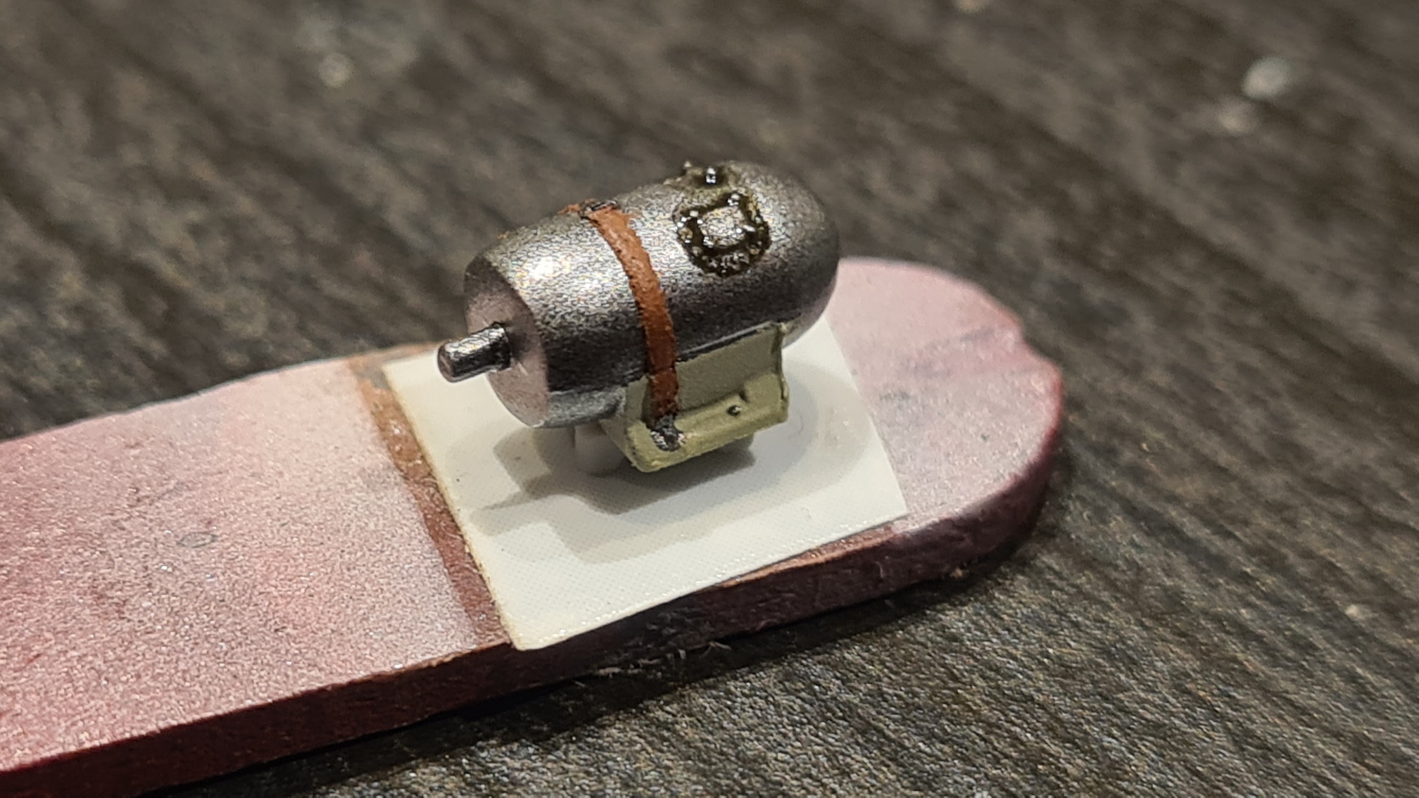 Wieder abkleben und den Riemen malen. In diesem Fall wurden 2 Acrylfarbe aus der Tube willkürlich aufgemalt. Später noch etwas ausgebessert und mit Pigmenten verdreckt:
