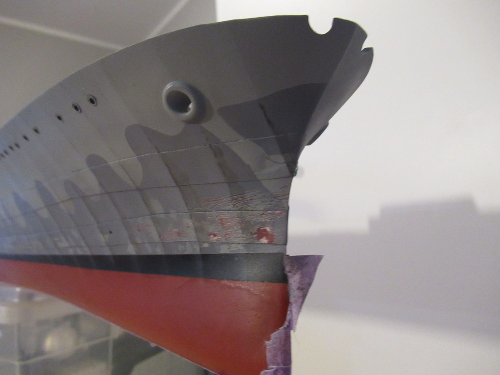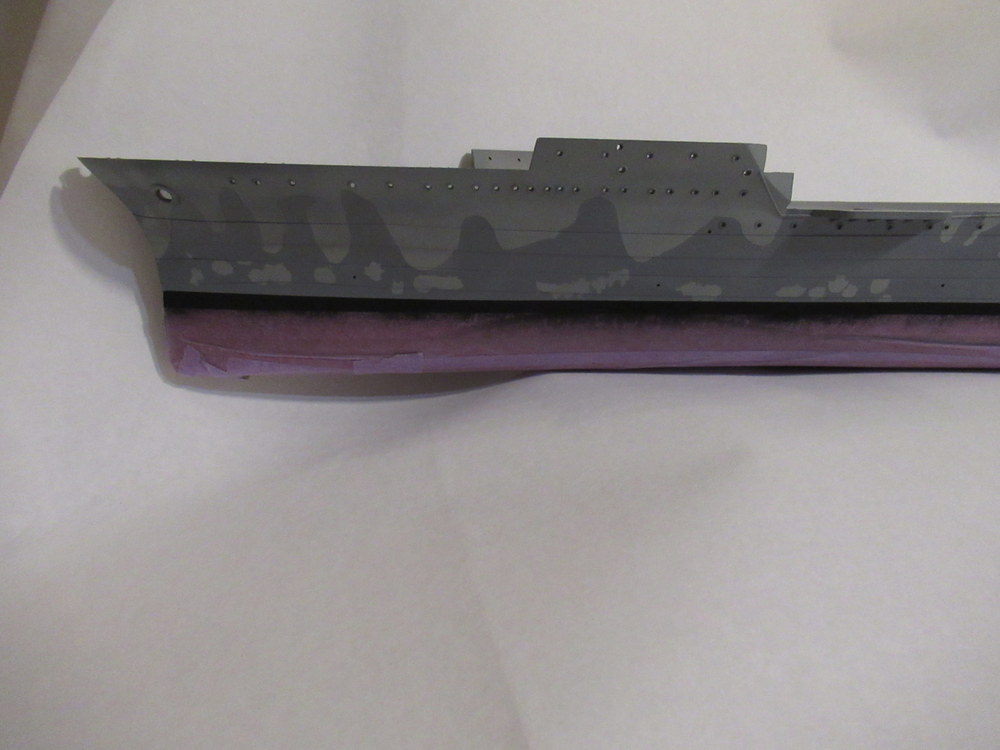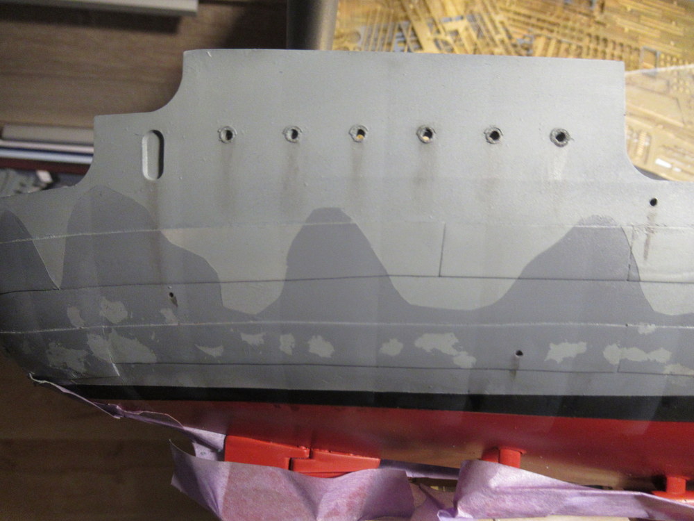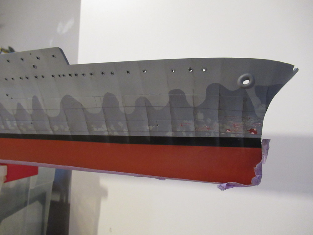 Auch der Rumpf hat dann erst mal sein helleres Grau ( Tamiya 83 ) bekommen. Somit sah das ganze schon mal recht gut aus .Das Schiff hat ja eine art Wellenmuster . Diese wird in Blaugrau lackiert (Tamiya 53 ) Hätte ggf noch eine Nr Dunkler gekonnt aber für mich ist das so OK .