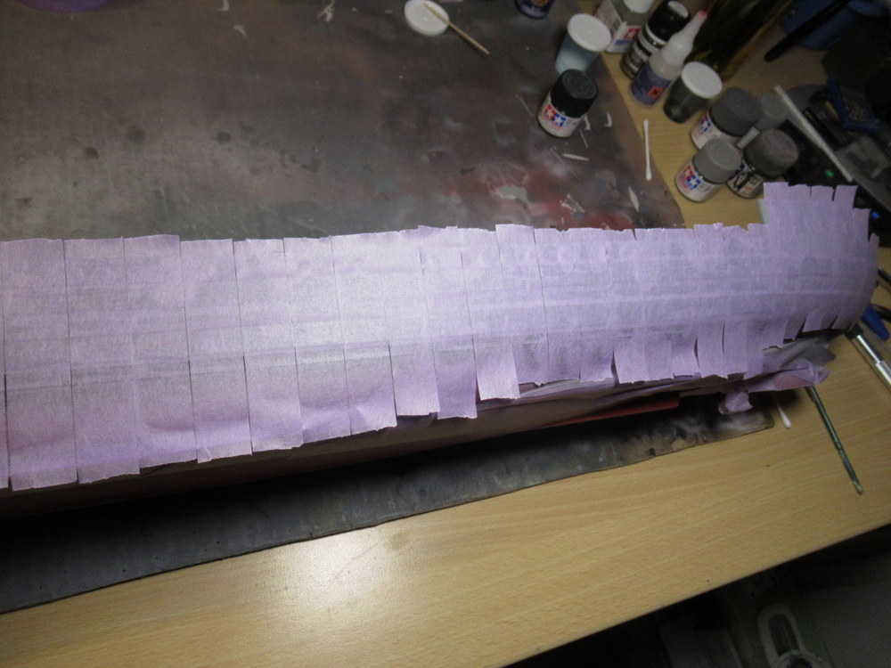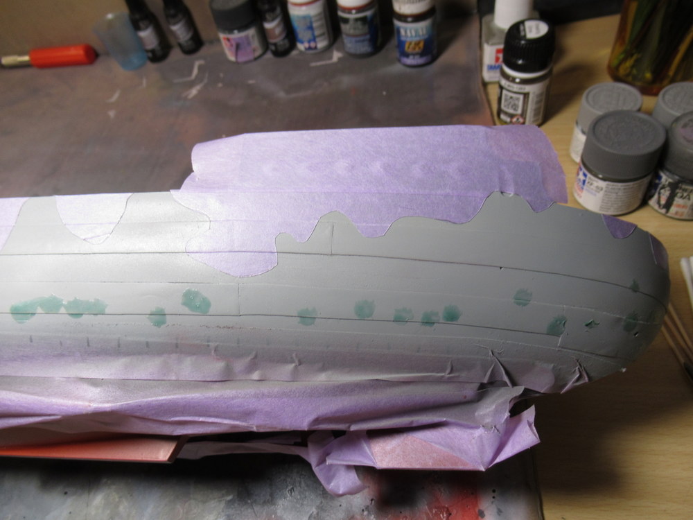 Dieses ist Hellgrau lackiert . Es erfolgt das Abkleben und das Aufzeichen des Tarnanstrichs . Dieses wurde dann mit einem Skalpell ausgeschnitten . Das ganze wird dann in Dunkelgrau Lackiert ( morgen )