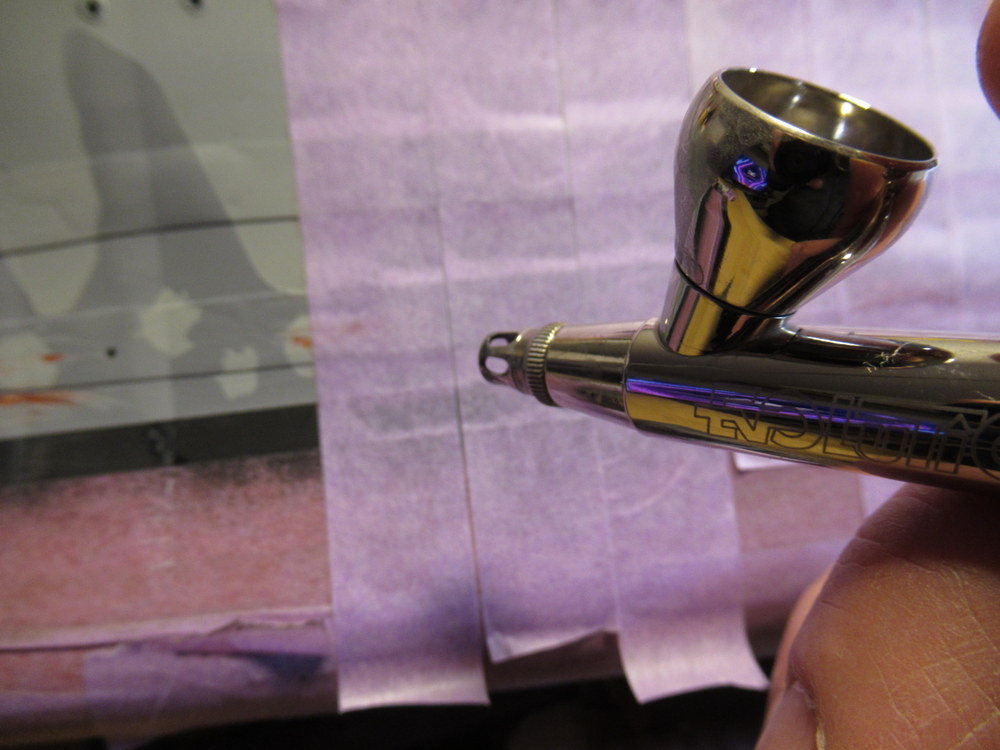 Ich sprühe nun ganz leicht einen weissen Schimmer links neben das erste Abklebeband . Die Airbrush leicht angewinkelt damit das weiss etwas nach Links über das Abklebeband sprücht und wir einen leicht hellen Film haben .
