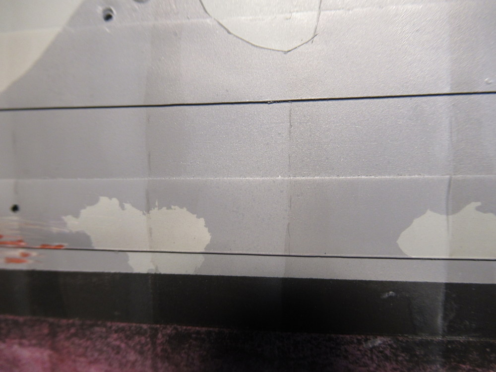 Die Spanten die durchschimmern sollen haben einen gewissen abstand ( je nach Schiff etc. ) Ich habe hier bei meiner Hornet 2 cm gewählt . Ich habe dann auf dem Rumpf einen Senkrechten Strich gezogen und hier das erste Klebeband aufgeklebt . Dieses ist 2 cm breit , somit konnte ich dann 1 Klebeband neben dem anderen aufbringen .