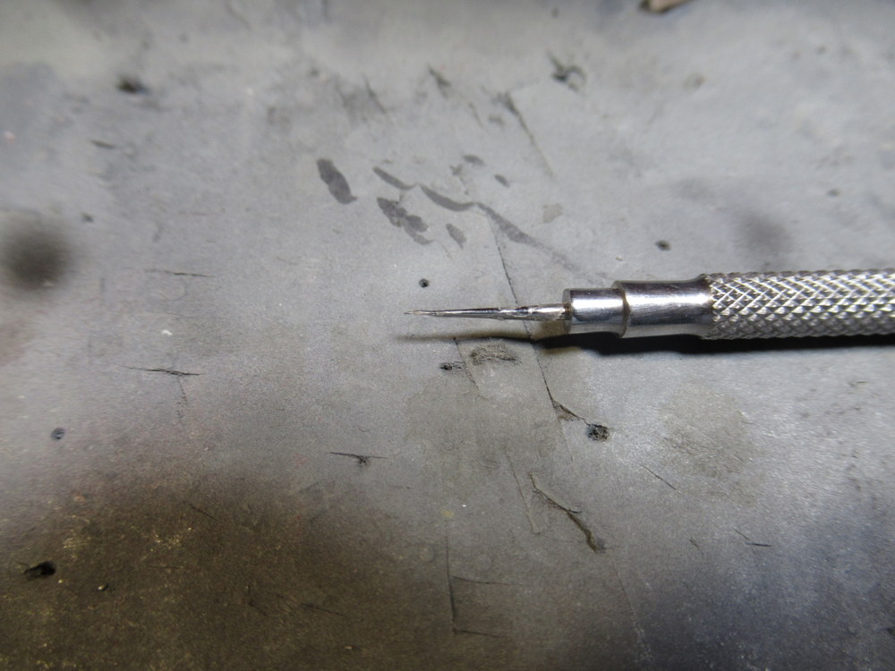 Mit dieser Brühe betone ich ganz leicht die Fläche rechts neben dem weissen Strich . Je Dunkler man beides macht ( Weiss wie auch Schwarz ) je ausgeprägter erscheint die Delle. Also muss man hier vorsichtig sein . Nachtönen geht immer ... Aufhellen wird da schon ganz schwierig . .