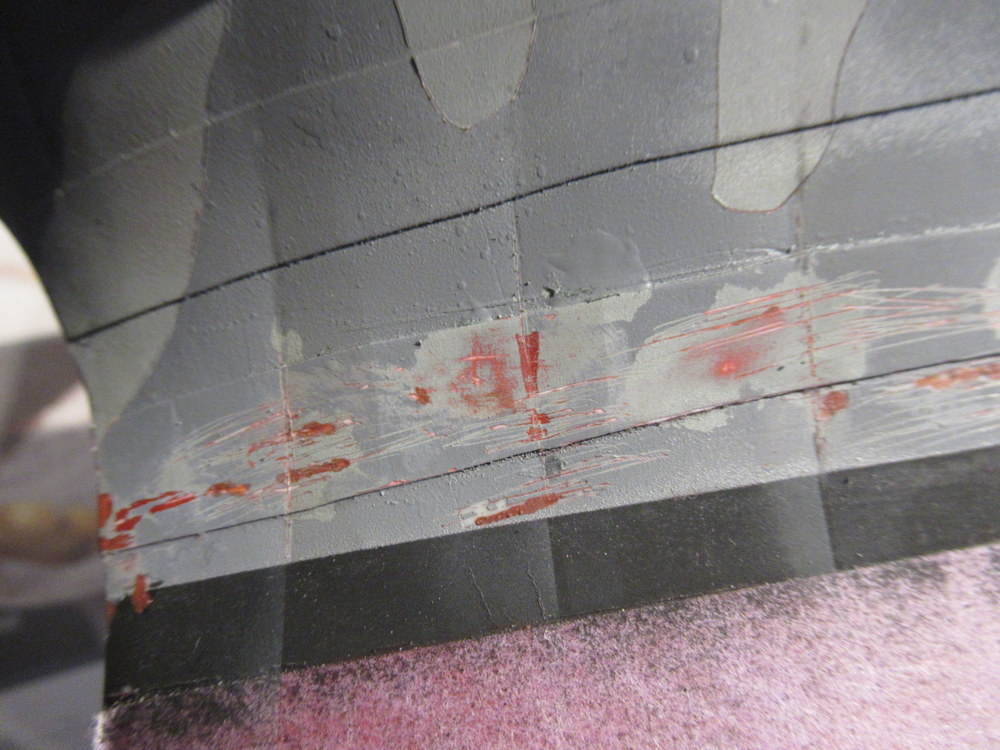 Somit habe ich erst einmal die Bereiche wo Rost durchschimmern soll in Rostrot gemacht . Nach trocknen der Farbe kam ein wenig Chipping Medium / Yallejo Liquid Mask darauf . Darüber wurde dann das Schiff in Grundfarbe ( Hellgrau ) lackiert .
