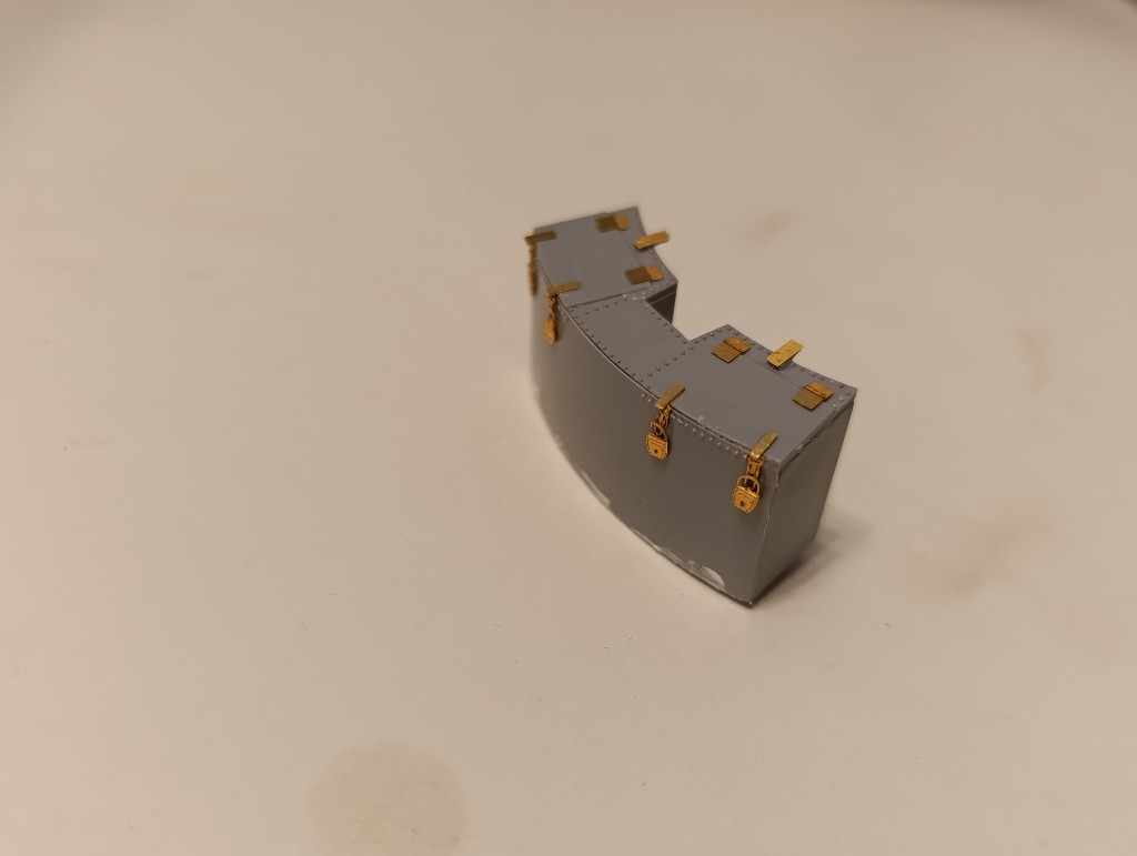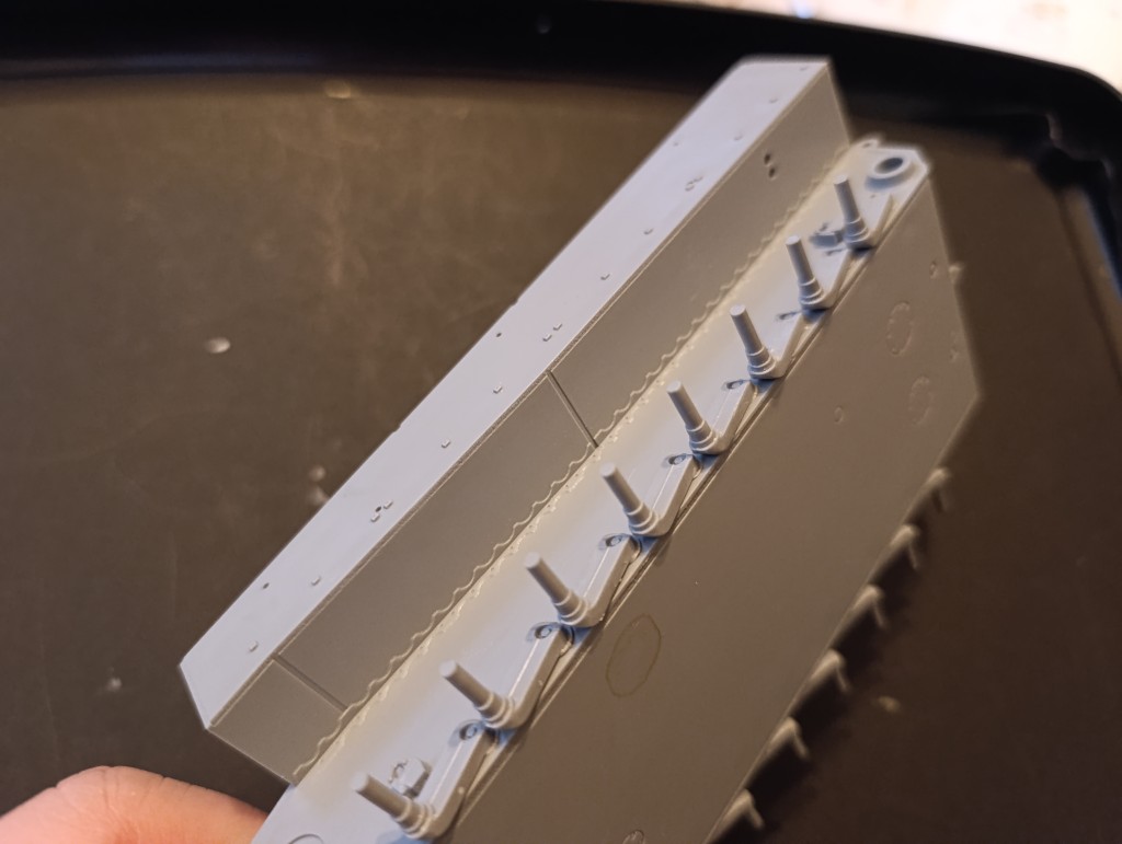 Die zusammengesetzt Turmhälften müssen auf alle Fälle auch verspachtelt werden, das bleibt nicht aus und kleine Fischhäute sind auch an mehreren Teilen zu finden, nicht dramatisch, muss aber trotzdem entfernt werden
