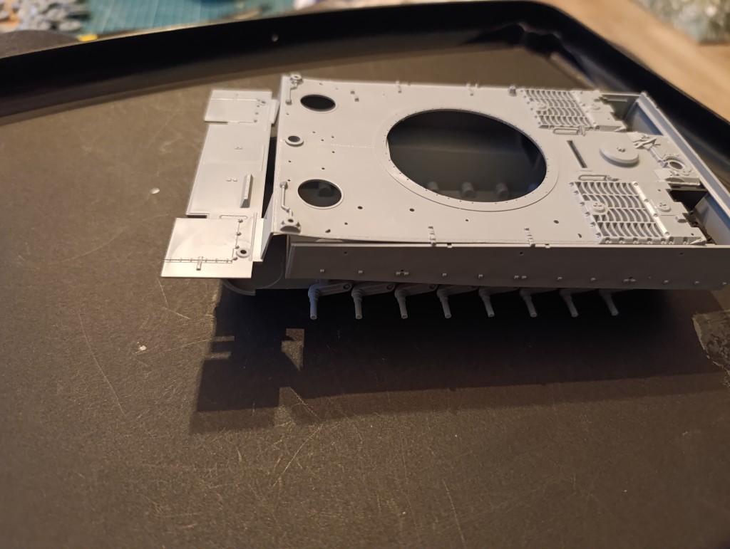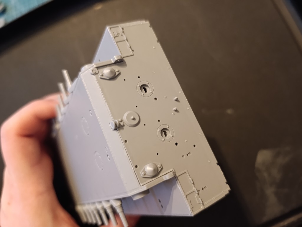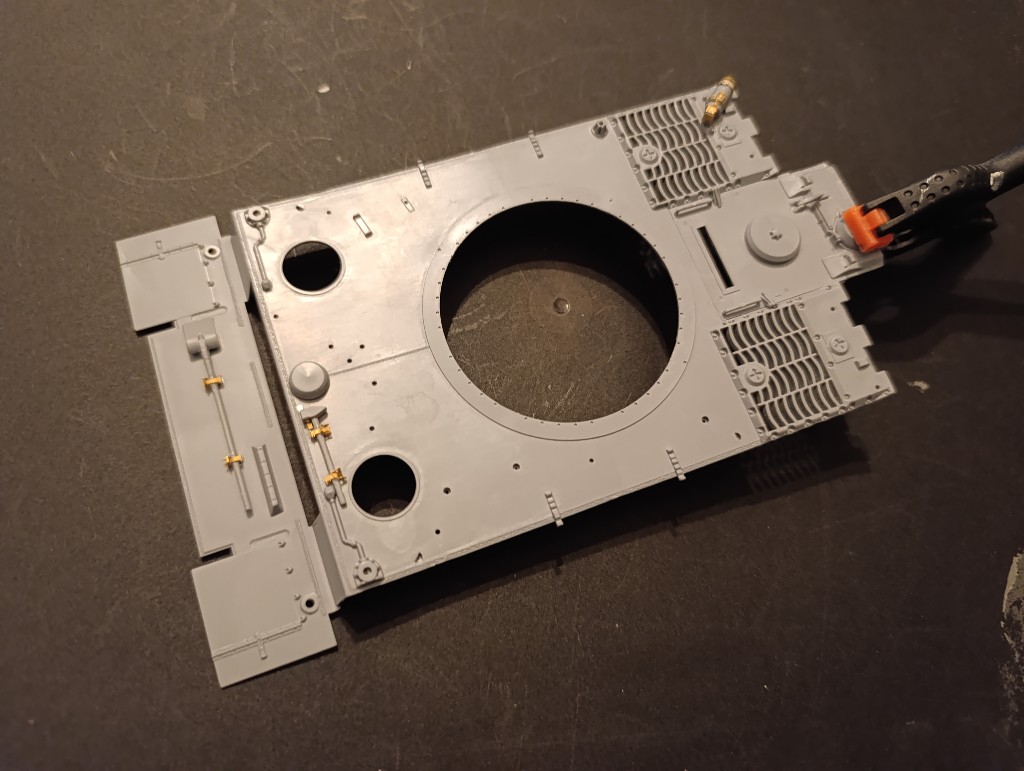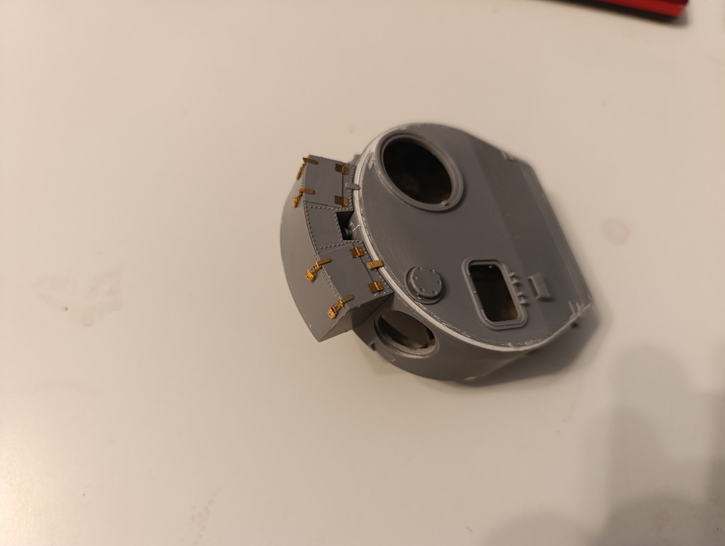 Es ging weiter mit dem Panzer. Ich habe erstmal den Turm Verbunden und die über gebliebenen Löscher die nicht gebraucht werden, zu gespachtelt. Außerdem die Staukiste Verbaut.