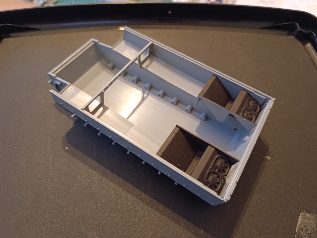 Zunächst wurde nun die Wanne weiter ausgeschmückt. Hier wie gesagt nur die Motorlüftung und eine Zwischenwand um mehr Stabilität in die Wanne zu bekommen.