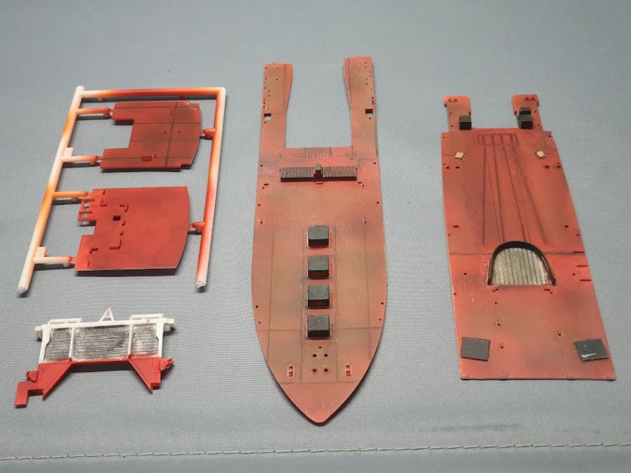 Die Seitenwände des Fangdecks wurden grau lackiert, anschließend bekamen die Seitenwände schon ihren Rostauftrag. Dazu habe ich Vallejos Washing „Rost" mit der Airbrush aus etwa 30 cm Entfernung auf genebelt. Auf die unteren Kanten habe ich dunklen, also alten Rost, aufgetupft.