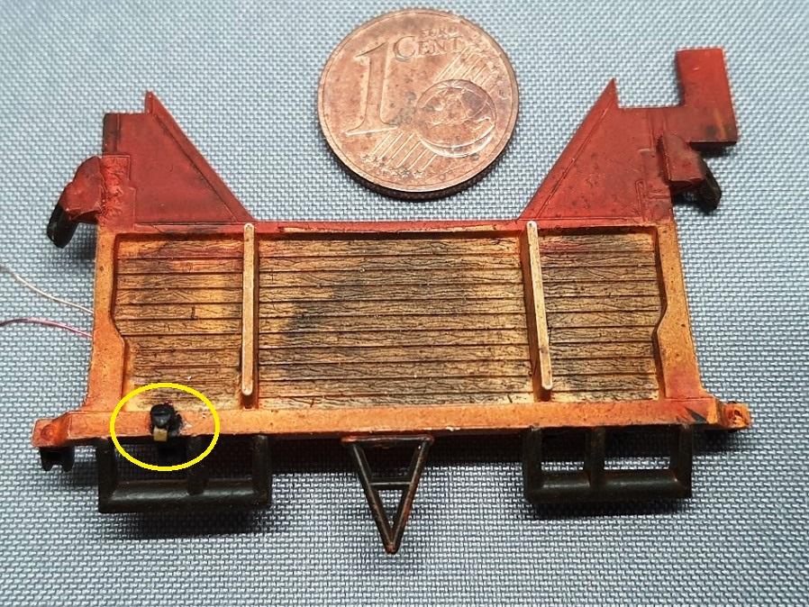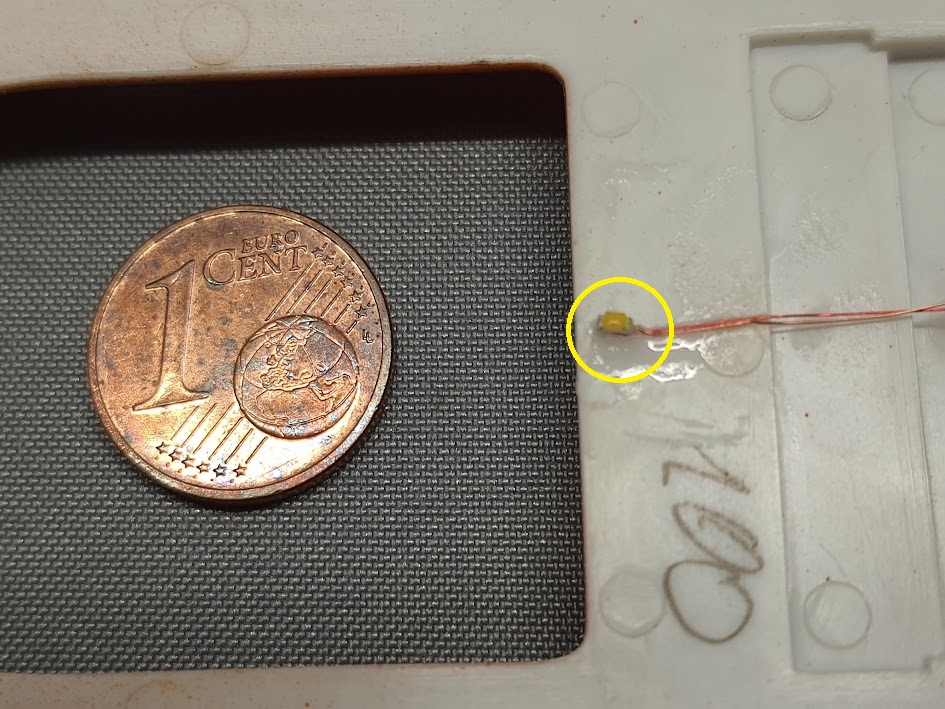 Da ich das Modell ja ein wenig beleuchten möchte hatte ich schon vorher zwei LED-Scheinwerfer montiert. Das Abkleben der SMD LEDs hat mich, glaube ich, mindestens 5 Jahre meines Lebens gekostet. Wenn ich die Maße richtig im Kopf habe ist der Leuchtkörper 1,8 x 0,9 mm groß.