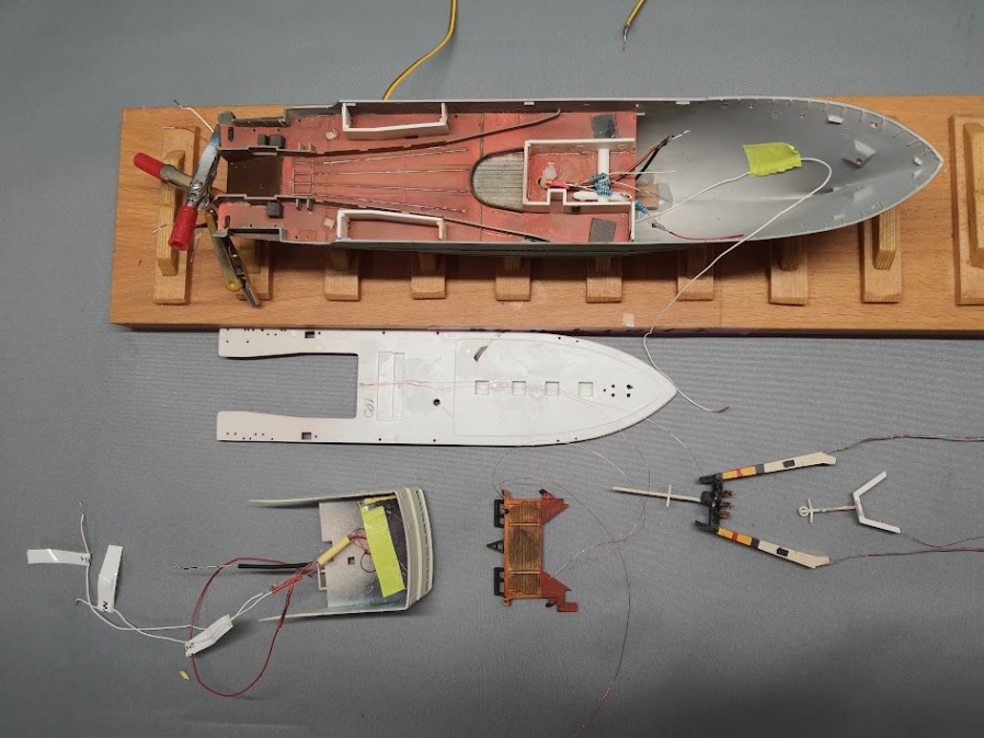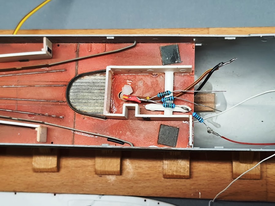 Das Modell sollte die Grundausstattung der, für See Schiffe vorgeschriebenen, Leuchten erhalten. Das wären also Rot und Grün als Positionslampen, Hecklicht und zwei Topplichter in den Masten. Dazu noch „ein paar“ zusätzliche Leuchten an, und im Schiff.
