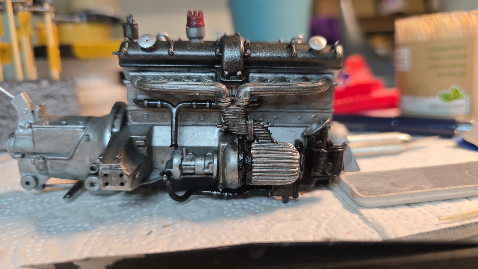 Der Motor ist auch fertig. Da die Motoren früher noch nicht wirklich dicht waren, durfte ein hoffentlich realistisches Ölwashing nicht fehlen. Dazu eine Stellprobe mit Getriebetunnel und Blattfedern.