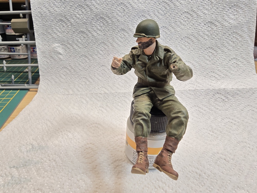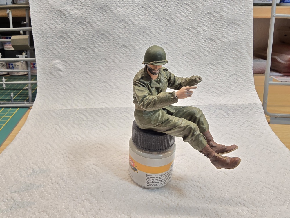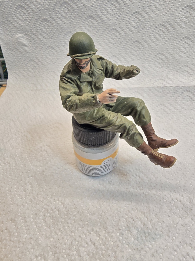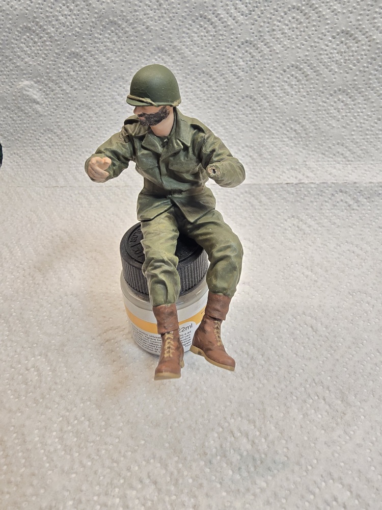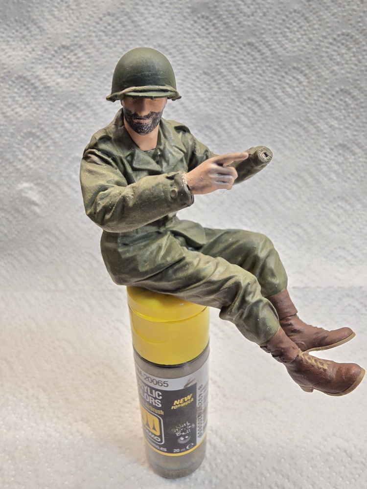 Nächste Farboption ist US Olive Base Uniform . Erst einmal alles damit bemalt . Die vertiefungen ( Falten ) habe ich dann mit Olive Drap gedunkelt . Die hervorstehenden Teile mit Base Uniform welches ich 50/50 mit Weiß gemischt habe , angemalt .