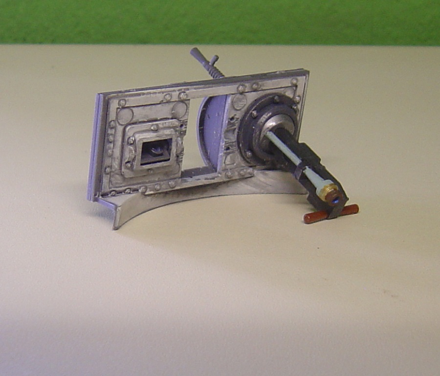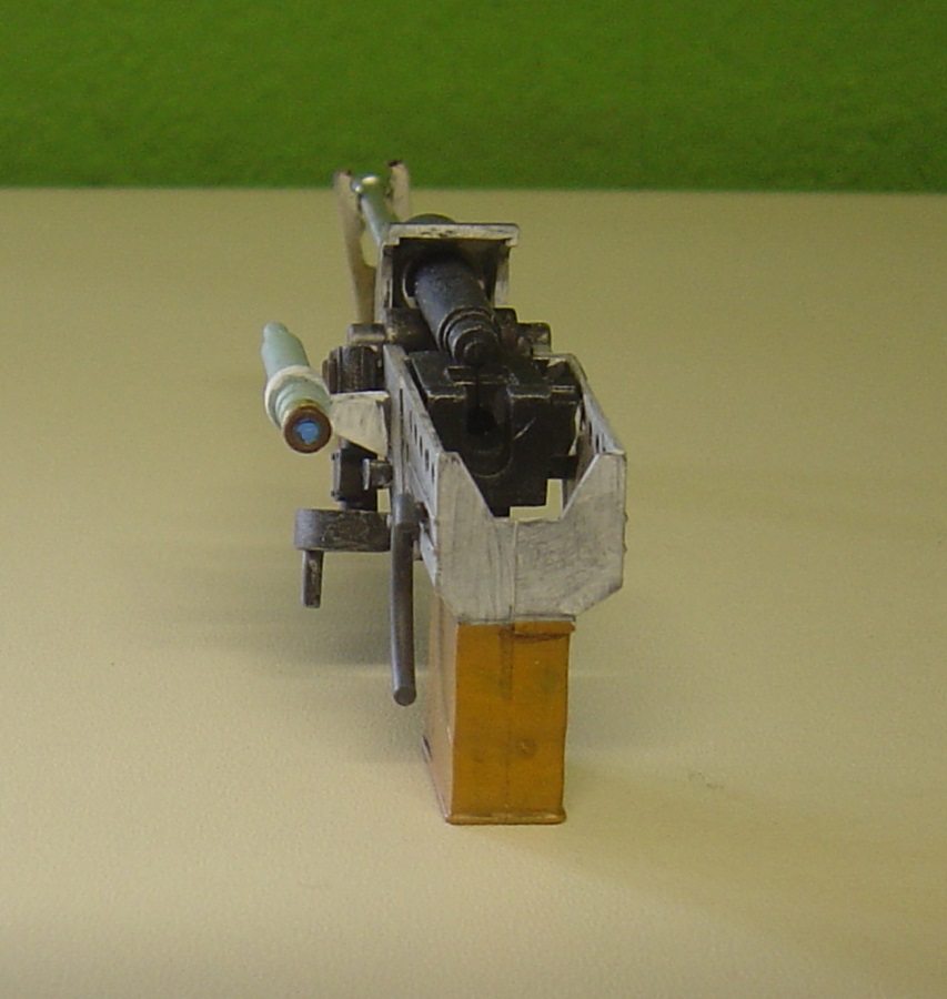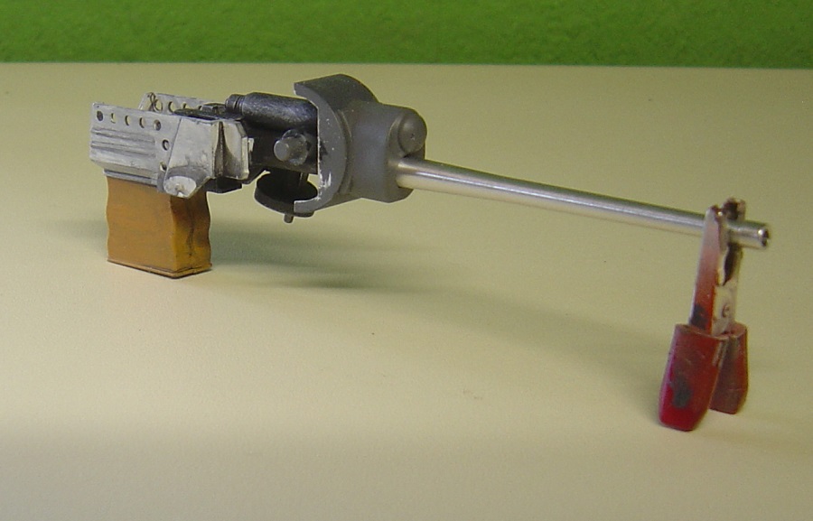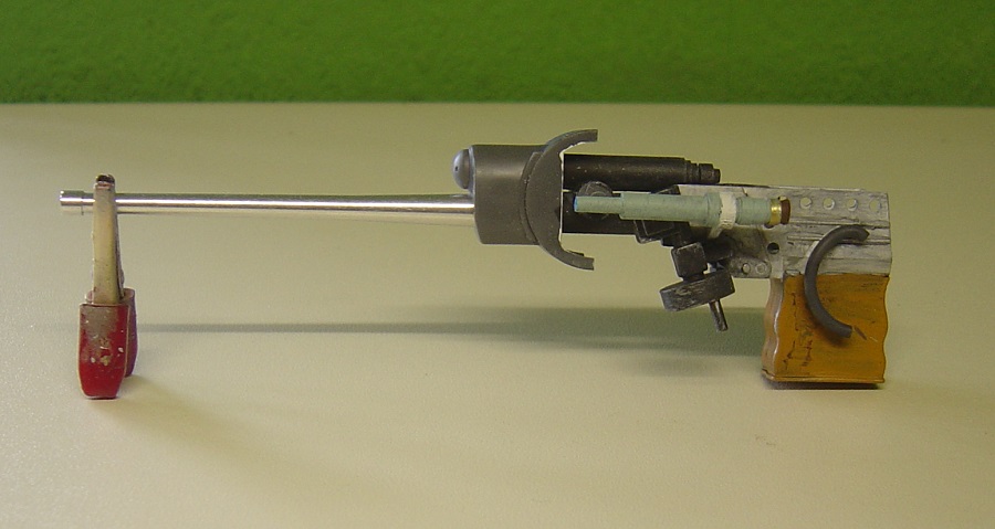 Hier mußte ich das erste Mal etwas ändern. Das dünnerer Teil vorn am Zielfernrohr war zu kurz und passte nicht bis in die Blende.