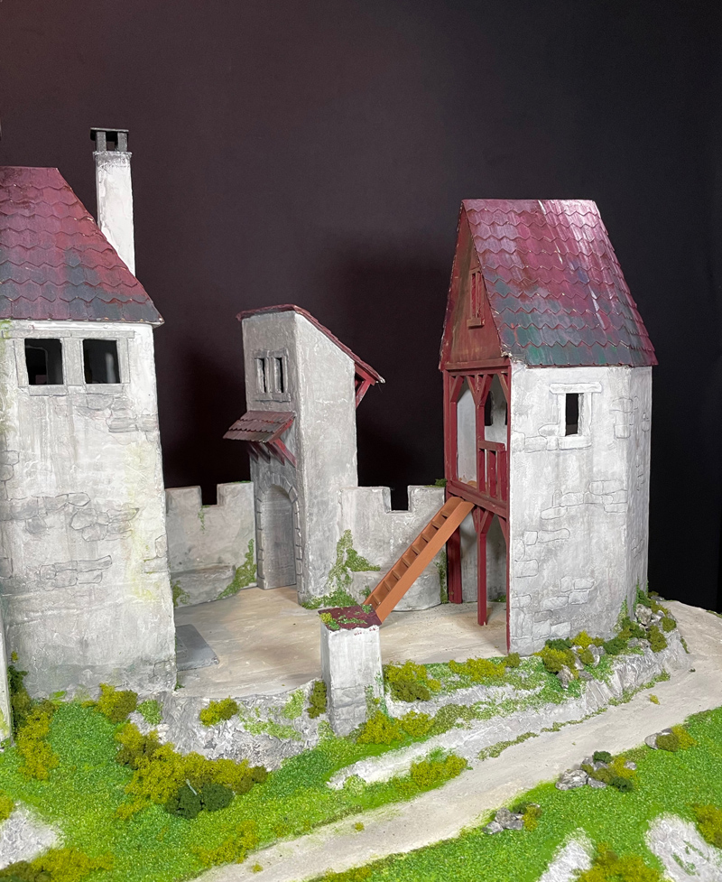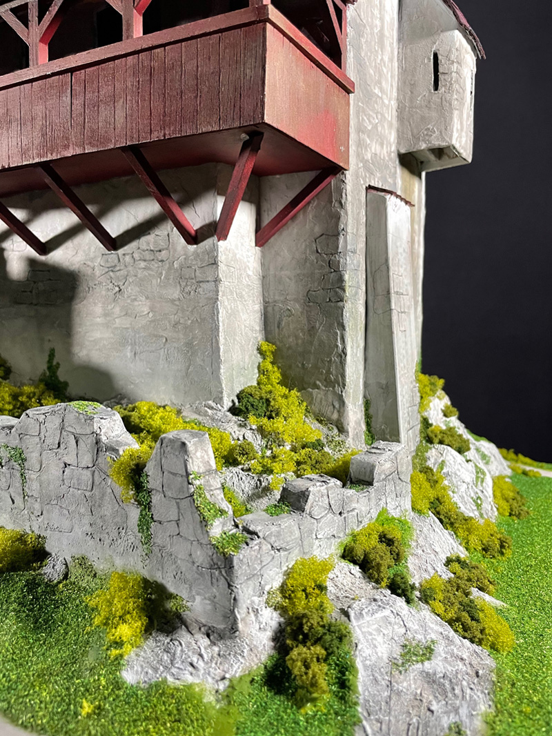 Als letzter Schritt wurde noch die Verbuschung aufgeklebt. Wie es sich um eine Spielburg handelt, konnte nur niedriges Material, das mit Acryl Mattlack verstärkt und fixiert wurde, zur Anwendung kommen.