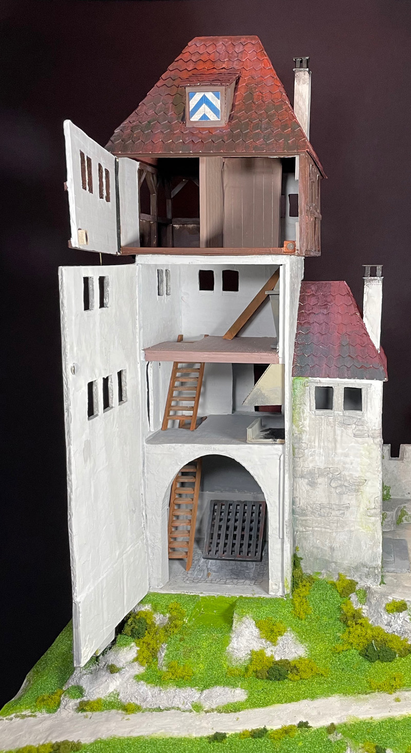 Erdgeschoss mit Verliess, Küche, Wohnraum mit Klo-Erker und Dachlaube.