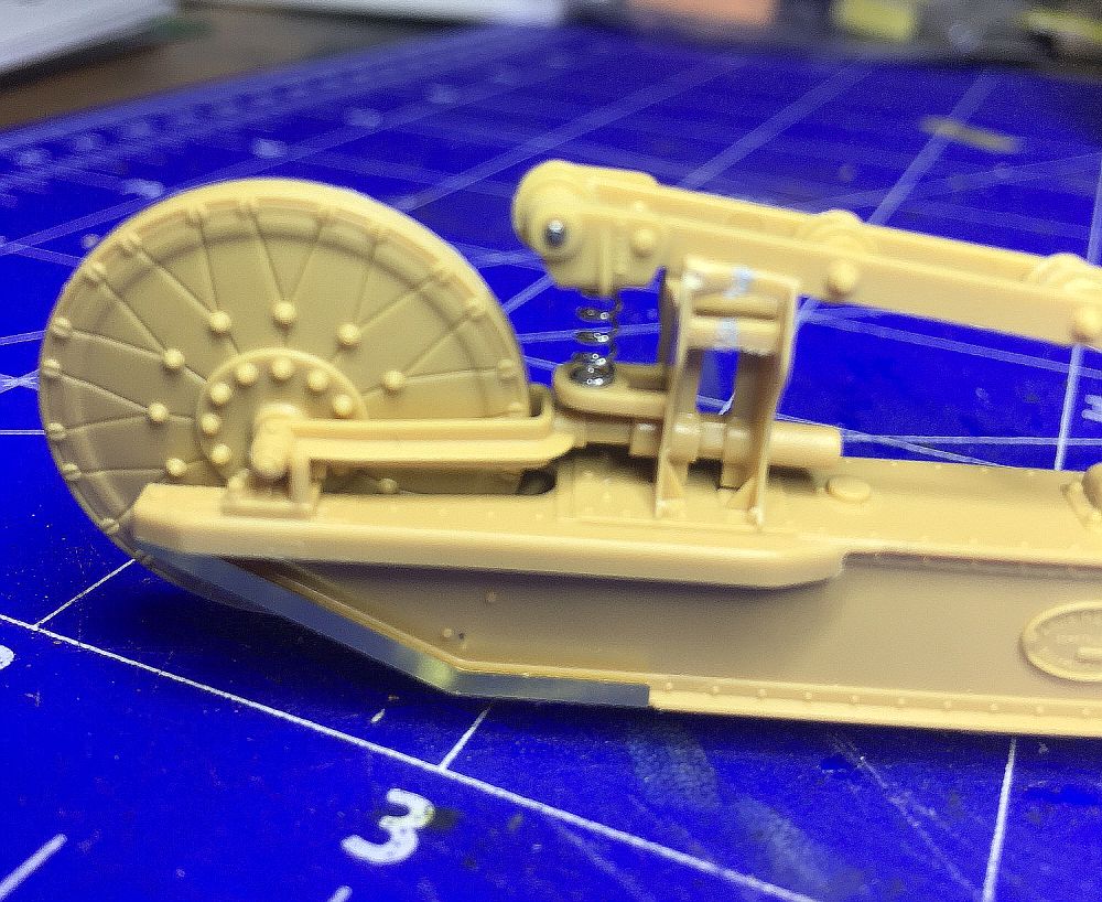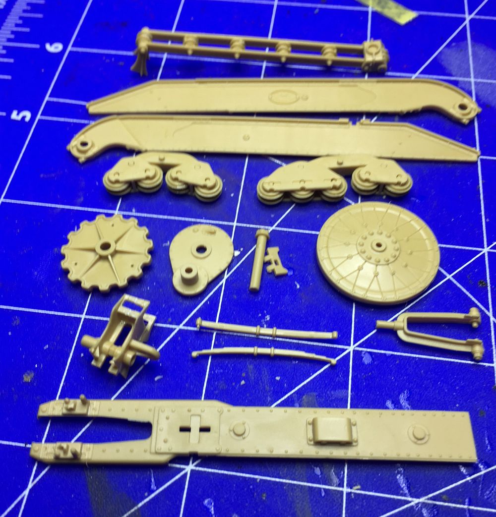 Nach etlichen Versuchen hatte ich es dann geschafft und freue mich schon auf das rechte Fahrwerk. Das große Leitrad ist nur gesteckt und wird separat lackiert. Die durchaus vorhandenen Blattfedern und weitere kleine Einzelteile sieht man leider nicht mehr.