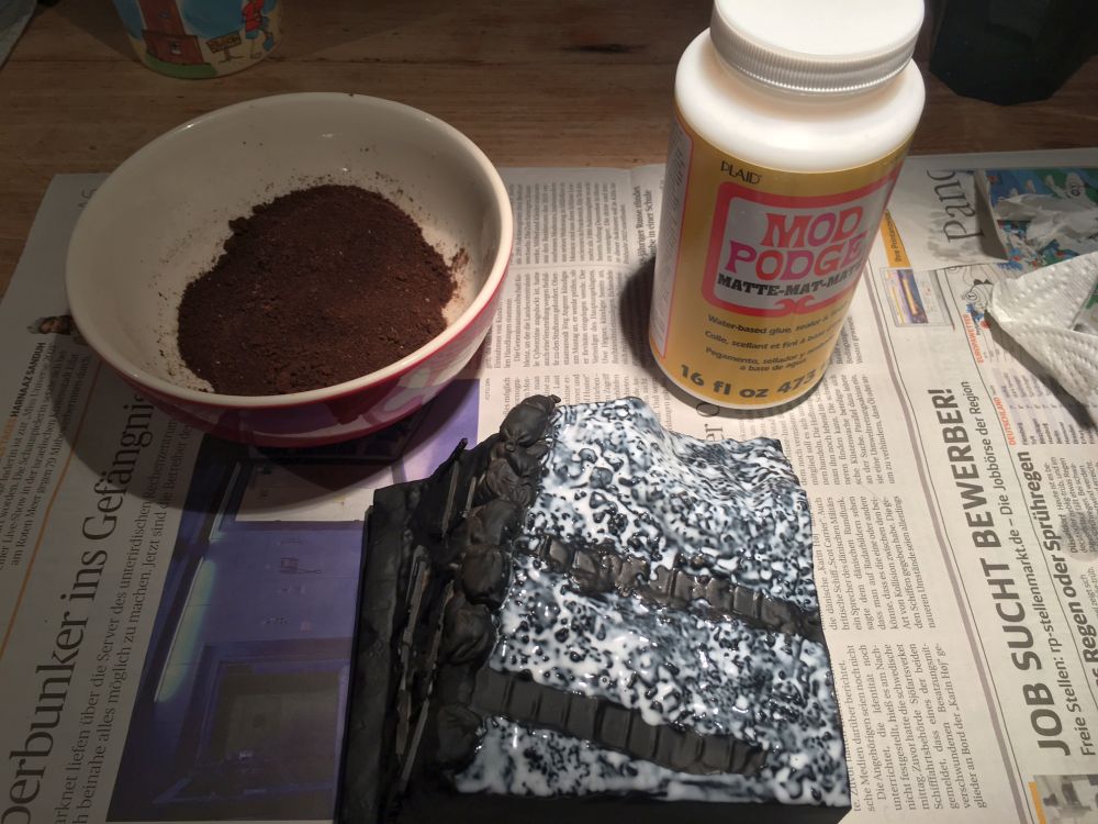 Danach wurde Kaffeesatz drüber gestreut. Der gibt eine gute Oberfläche, die auch noch gut riecht
