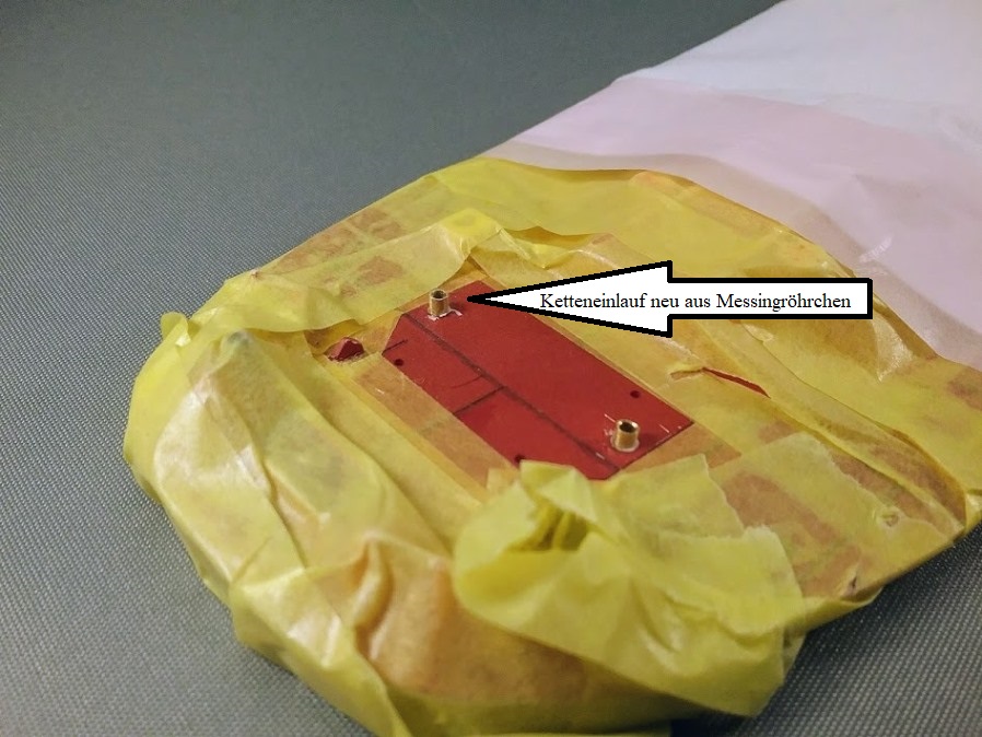 Beim Abgleichen mit den Vorlagebildern fällt auf, dass die beiden „Höcker“ auf dem Windensockel die Einläufe in den Kettenkasten für die Ankerkette sind. Da ich das Modell auch mit einer Ankerkette ausstatten werde muss ich die „Höcker“ entweder ausbohren oder durch Messingröhrchen ersetzten.