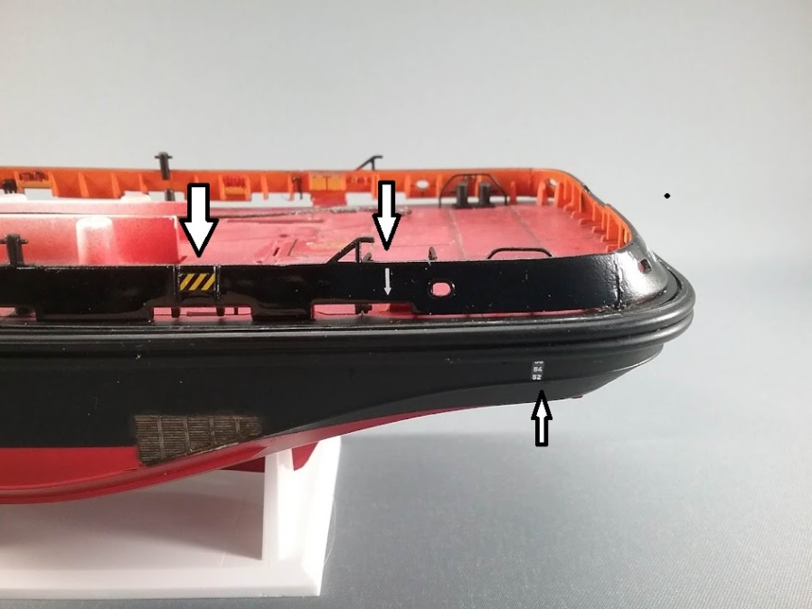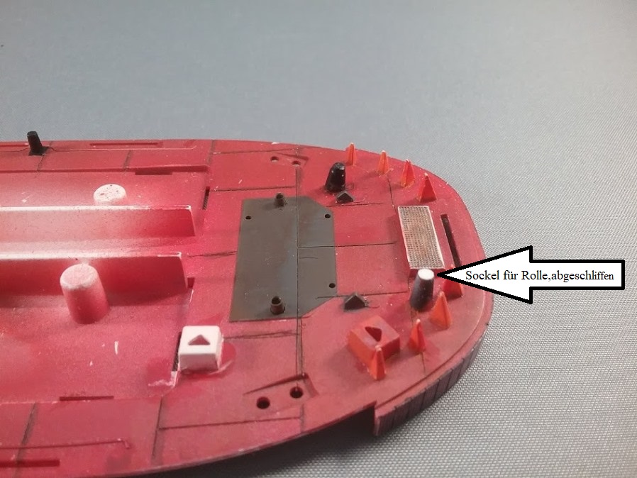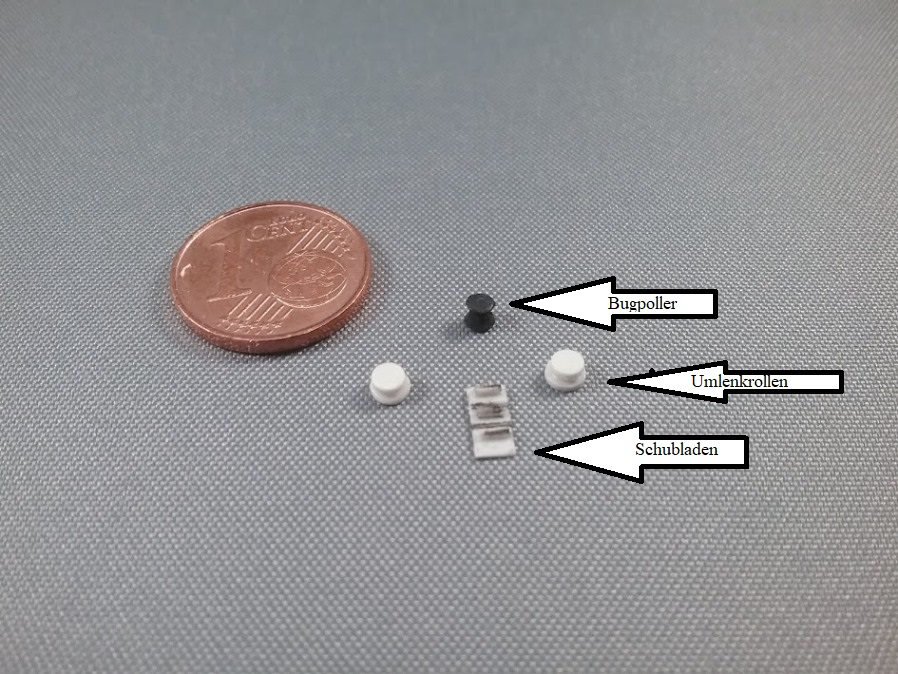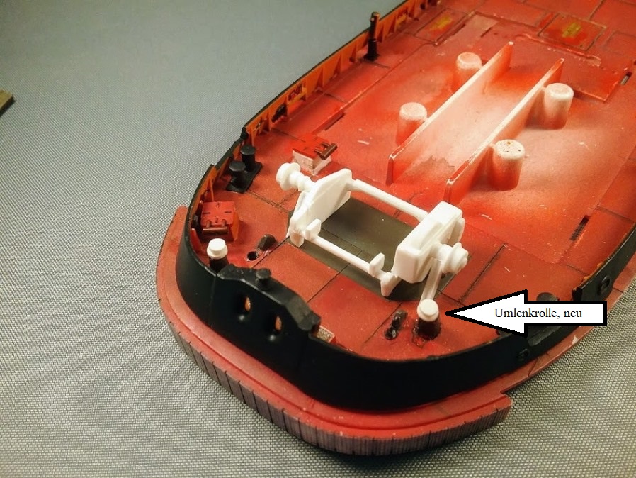 Um die Schleppwinde etwas zu modifizieren, habe ich mir aus meinen Vorlagenfotos, Ausschnitte herausvergrößert. Dabei fällt auf, dass zwischen Schleppwinde und Bug noch zwei Umlenkrollen und ein zusätzlicher Bugpoller zu sehen sind. Bausatzmäßig sind aber nur zwei „Kegel“ , als "Umlenkrolle" vorgegeben.
