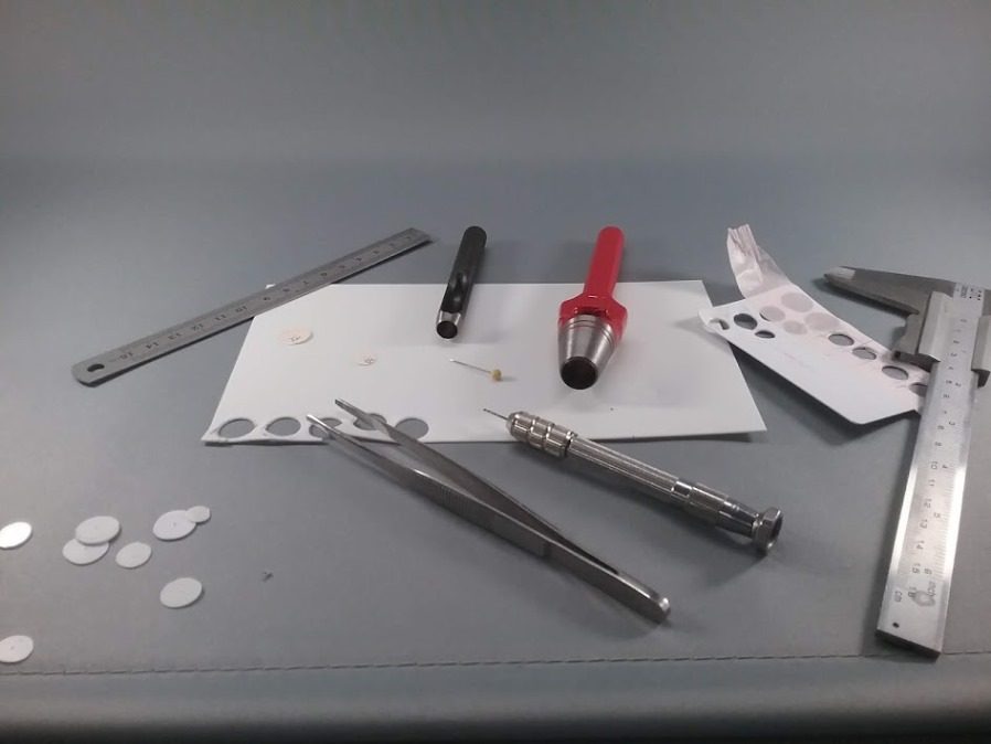 Als erstes habe ich aus 0,8er Sheet und Rohlingen für Ausweiskarten Scheiben für die Rollen ausgestanzt. Werkzeuge waren Locheisen, meine Lochzange und natürlich Bohrer.