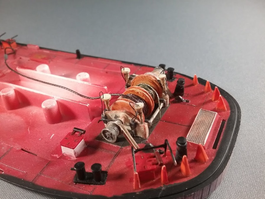 . . Als weitere Zusatzteile entstehen noch ein Poller für den Bug, den gibt es bei Revell ´s Vorlage, der Fairplay, nicht. Als letztes Detail werden noch „Schubladen" angedeutet die sich auf der linken Rückseite der Schleppwinde befinden.