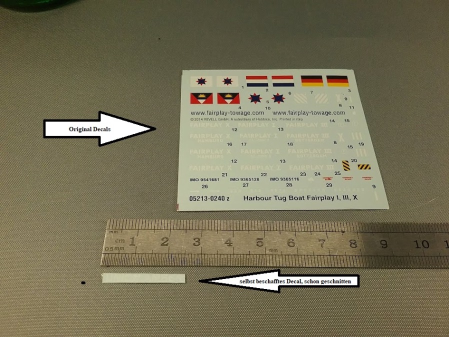 Die Anfertigung solcher Decals soll auch auf dem heimischen PC mit einem Tintenstrahldrucker möglich sein. Da ich aber ausschließlich zivile Schiffe baue und an diesen Schiffen die Beschriftung (meistens) in weiß ist, man „weiß“ nicht drucken kann, bin ich auf „professionelle Hersteller“ angewiesen.