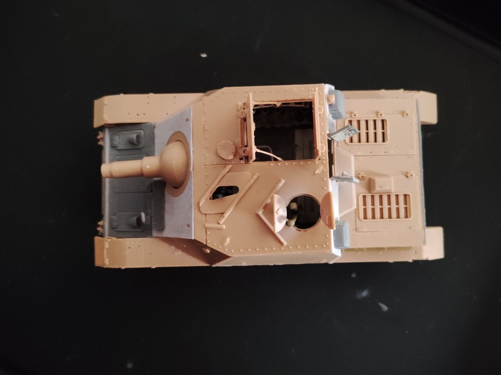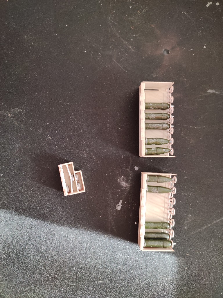 Als letztes hab ich mich Munitionskisten angebracht. Hier kommen später die Granten für die Sturmhaubitze. Als nächstes will ich den Innenraum Cremeweiß Lackieren