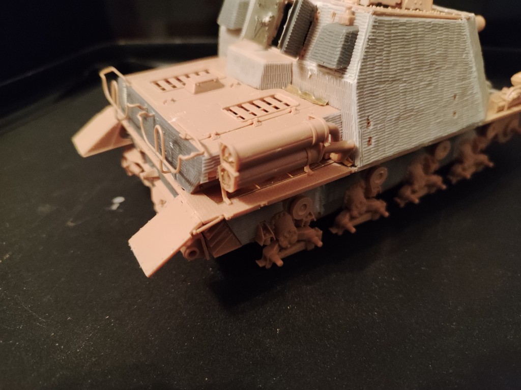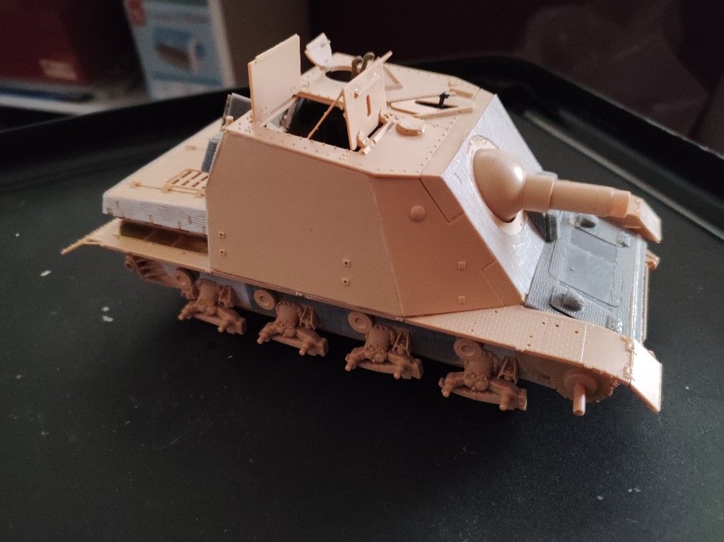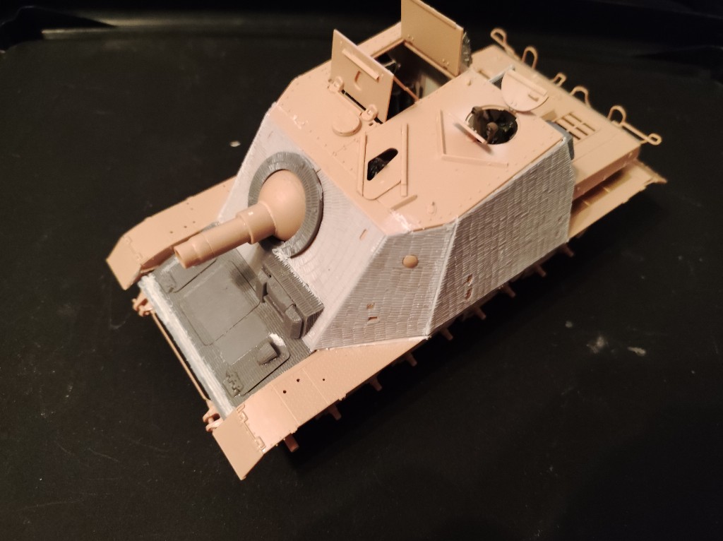 Ja dann ging es auch erstmal an der Front weiter. Diese ist von der Stärke auch in den richtigen Proportionen dargestellt. Das Zimmerit und der Sehschlitze ist auch bereits angebracht