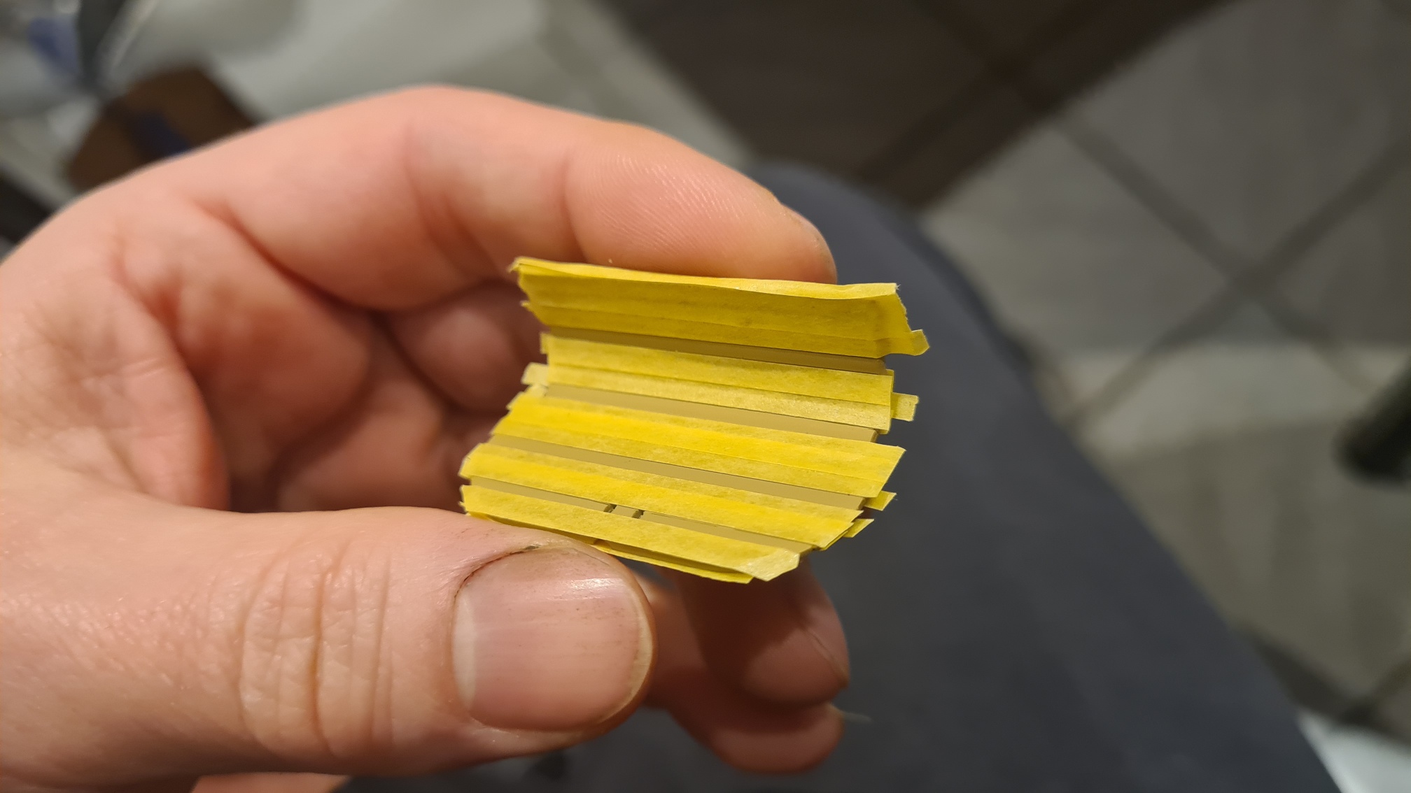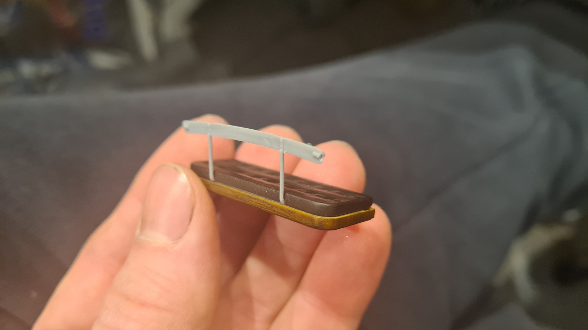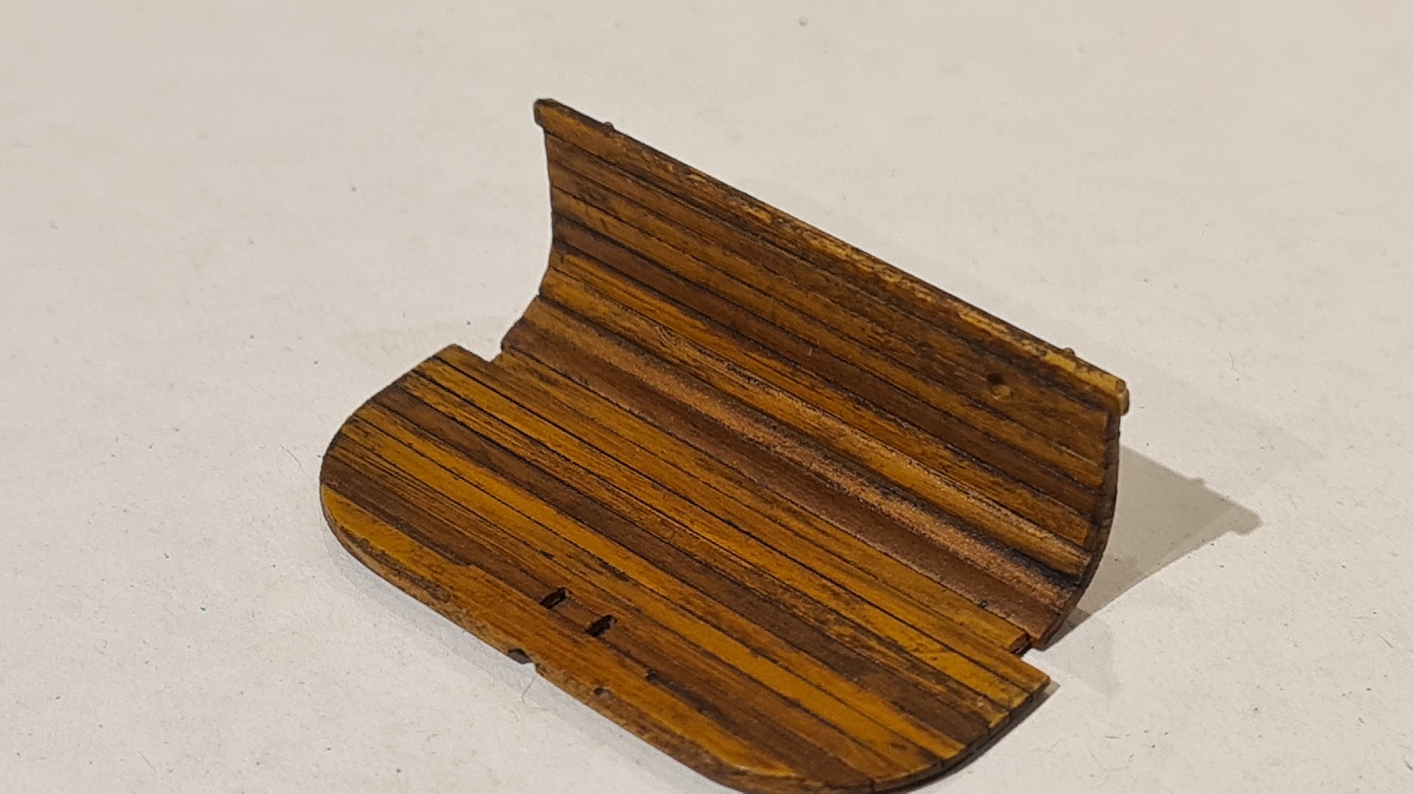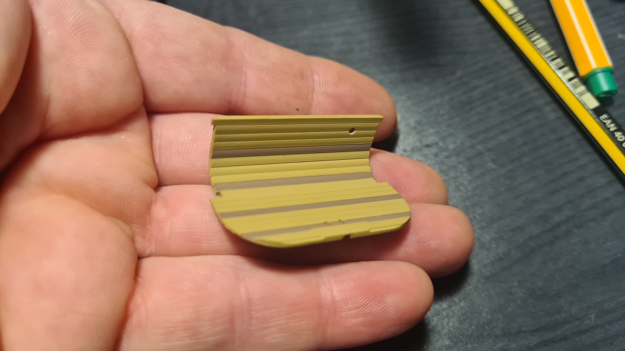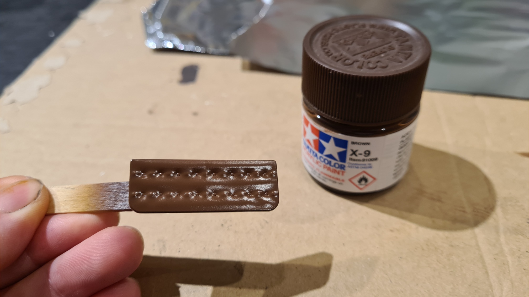 Das Ding war am Ende das erste erfolgreiche Versuchsauto. Ich möchte im Folgenden keinen perfektionierten Nachbau portraitieren, sondern mich etwas eher am Original ausrichten. Bei mir sind die Bretter nicht alle aus einem edlen Gehölz, sondern irgendwie alle etwas unterschiedlich. Ich habe daher den Spritzling als Basis mit Tamiya XF59 (wüstengelb) gesprüht und einzelne Bretter (beidseitig) mit XF-52 (Flat Earth) nachgedunkelt.