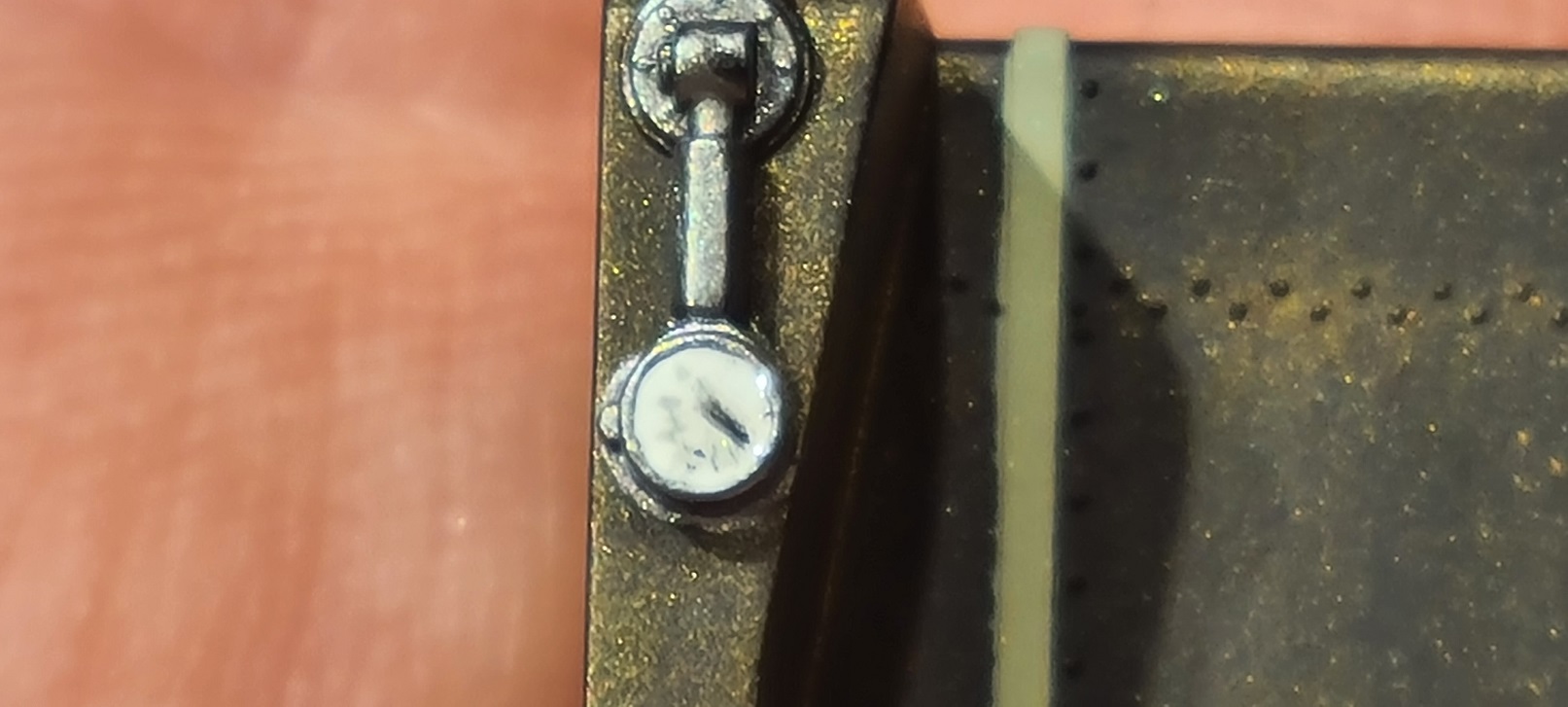 Dem Bausatz liegt hier kein Decal bei und ich hatte auch keins in der Größe übrig. Ich habe einfach weiß lackiert, mit einem schwarzen Faber Casett Polychromos Stift ein paar Striche als Skala/Zeiger draufgemalt und am Ende mit einem Tropfen Klarlack (=Glasscheibe) versiegelt.