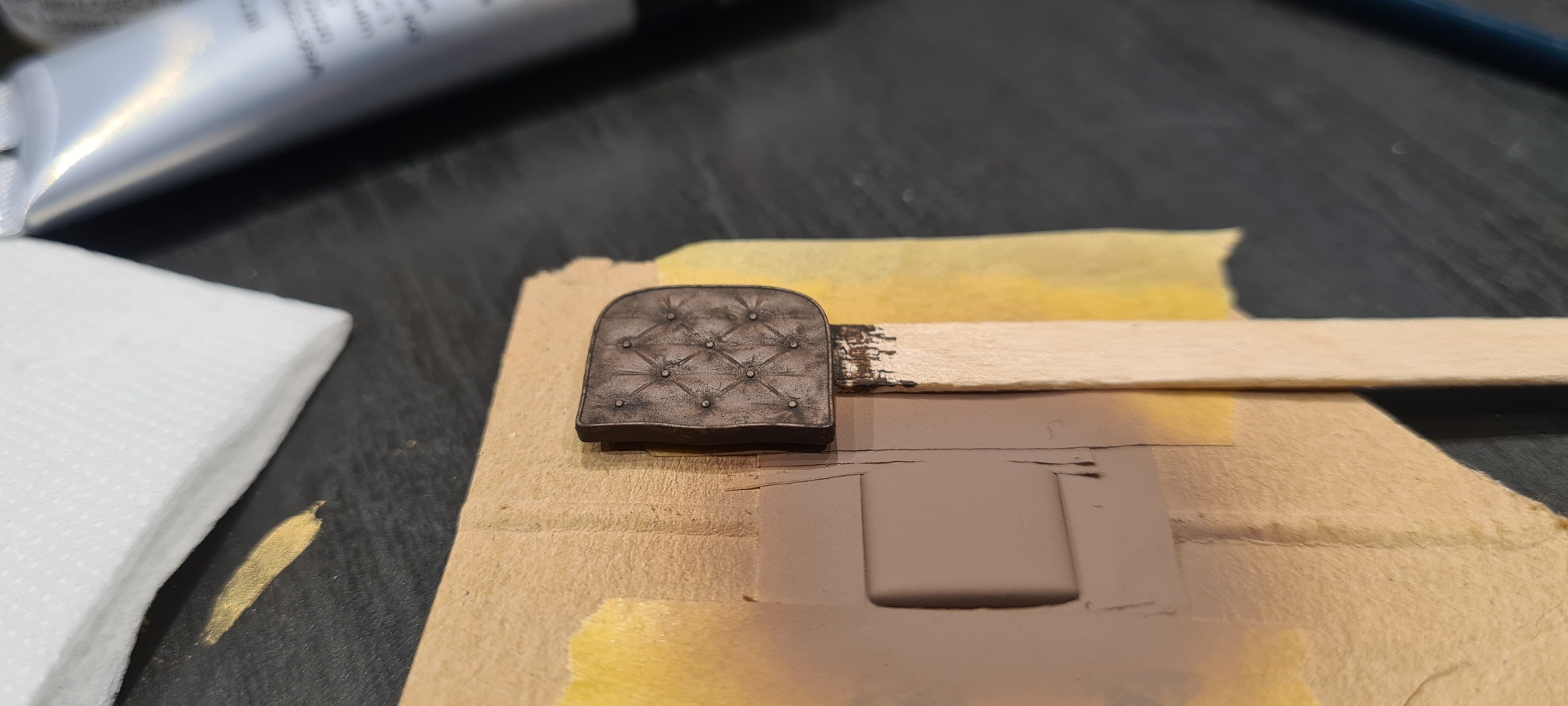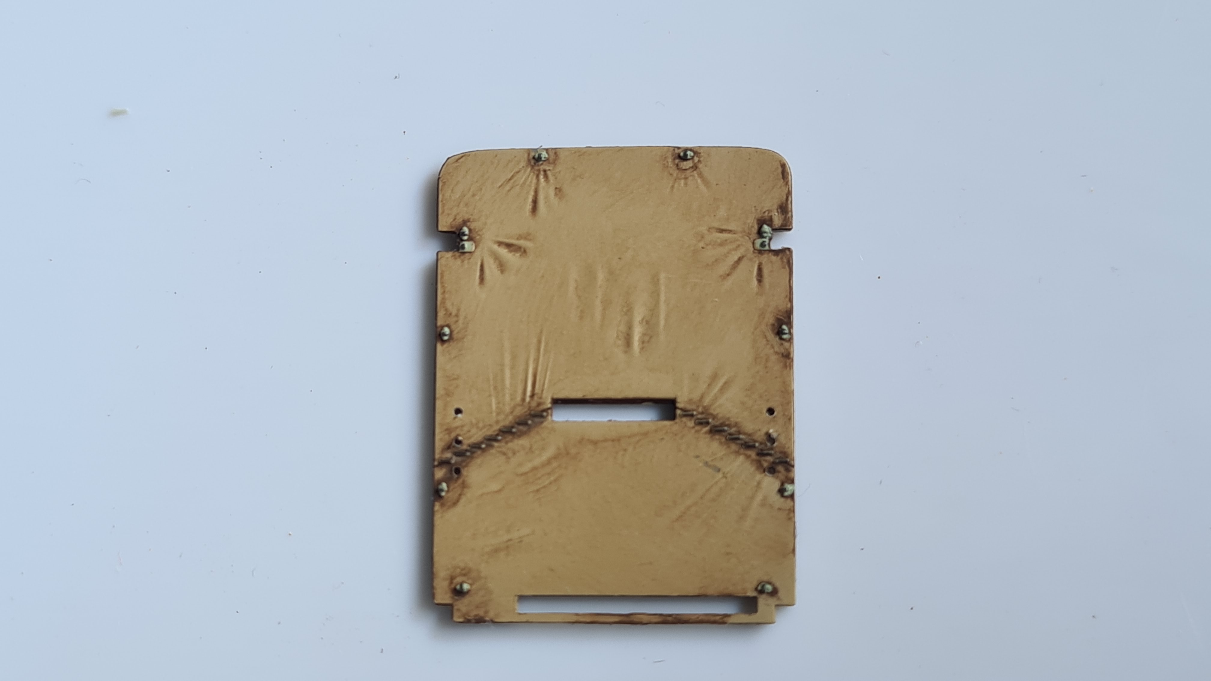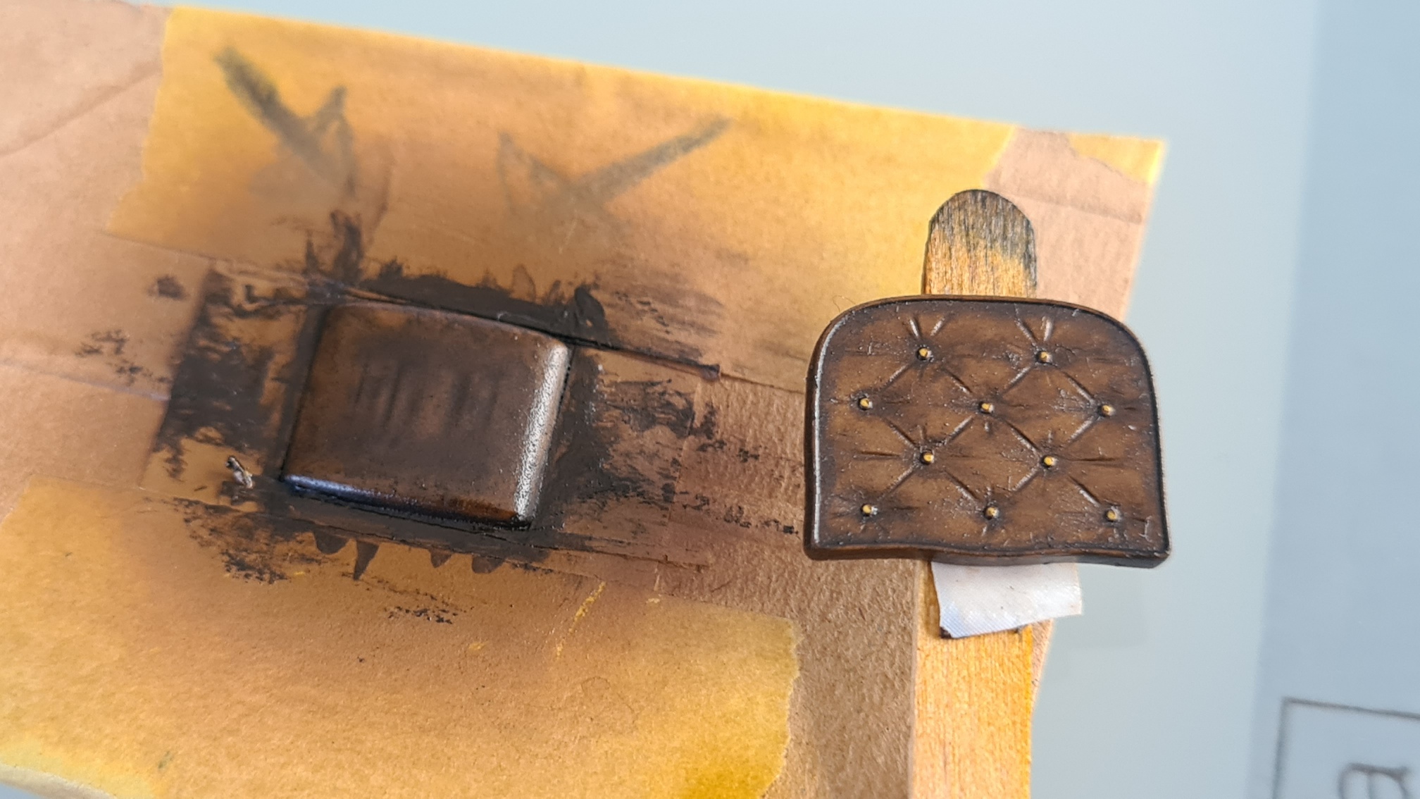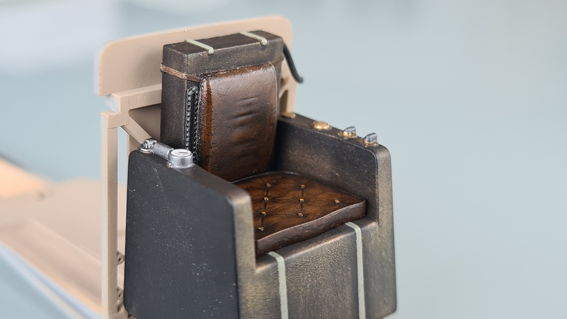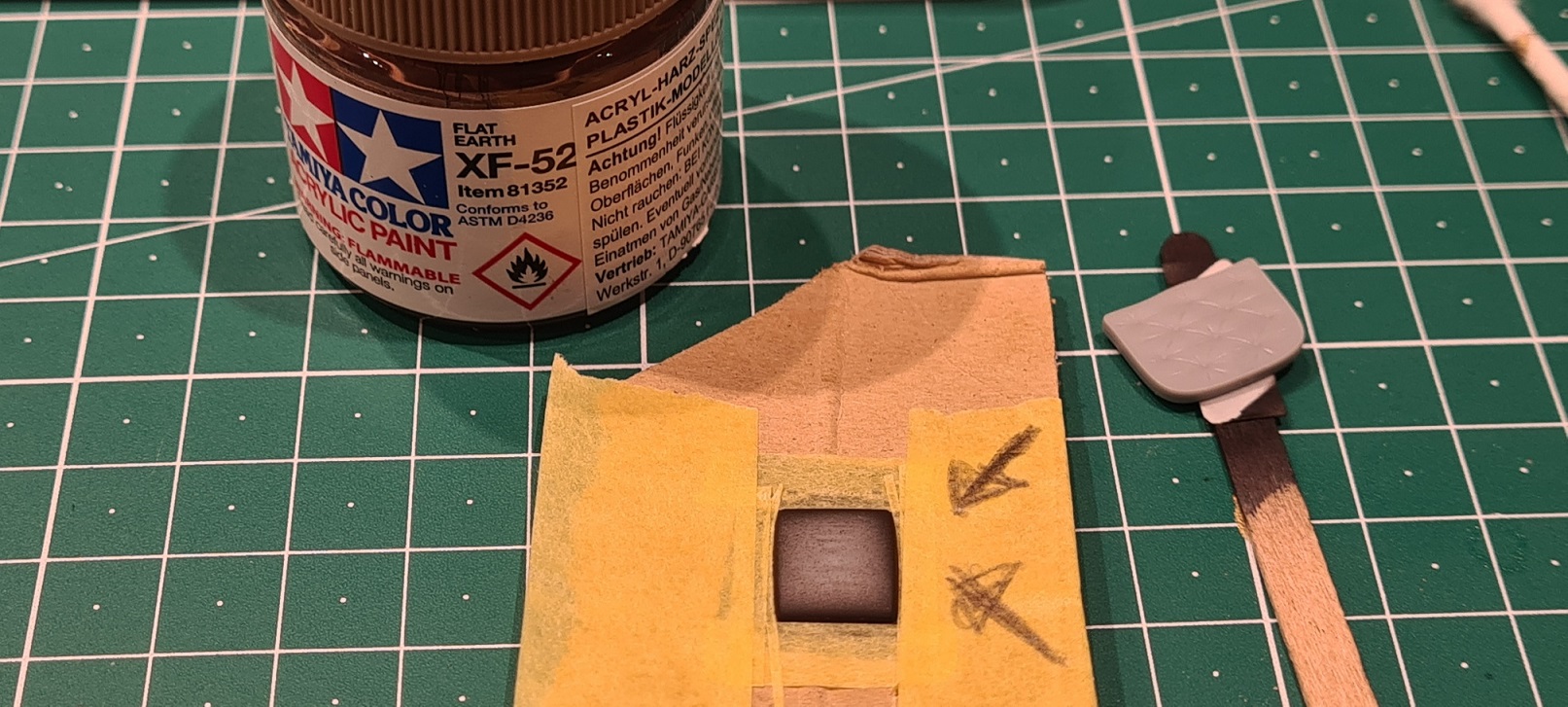 In obigem Bild kann man sehen, dass ich den Tank der Rückenlehne abgeklebt habe. Zu diesem Zeitpunkt war der nur schwarz, noch kein Messing drauf. Ich vermute, ich hätte sonst vom Klebeband unschöne Streifen im Messing gehabt. Gesprüht wurde beides dann mit XF-52, wie im Bild zu sehen.