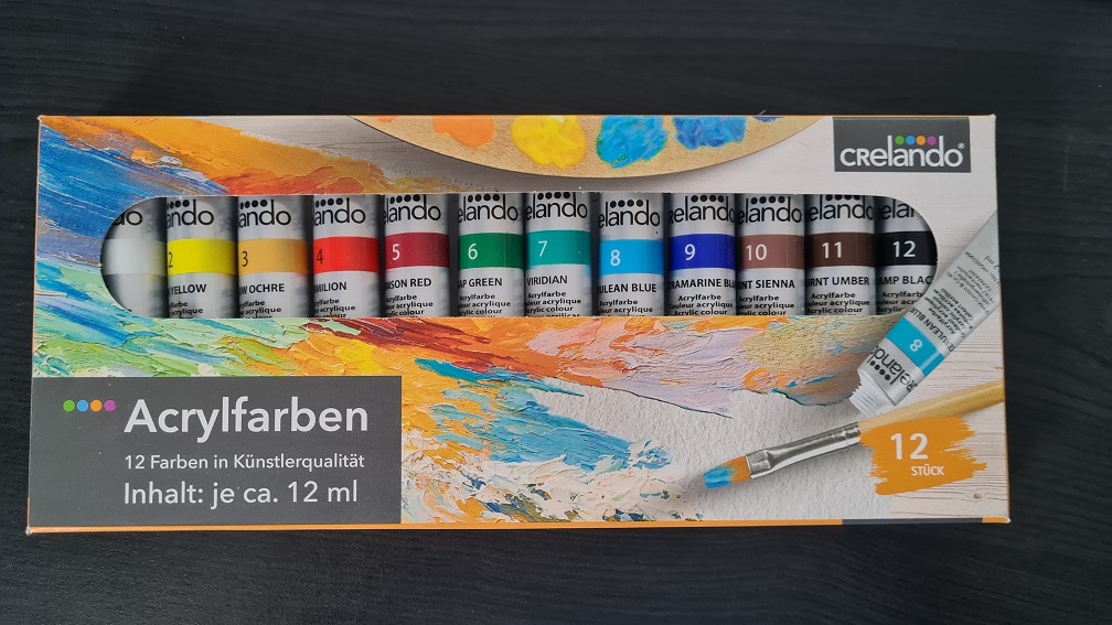 Normalerweise hätte ich sonst die Ölfarben herausgekramt. Aber ich wollte es diesmal anders probieren (bei Nichtgefallen wäre das Entlacken der beiden Teile recht einfach gewesen). Zum Einsatz kamen einmal mehr die Billig-Acrylfarben von Lidl, das ganze Set gab es für unter 5 EUR.