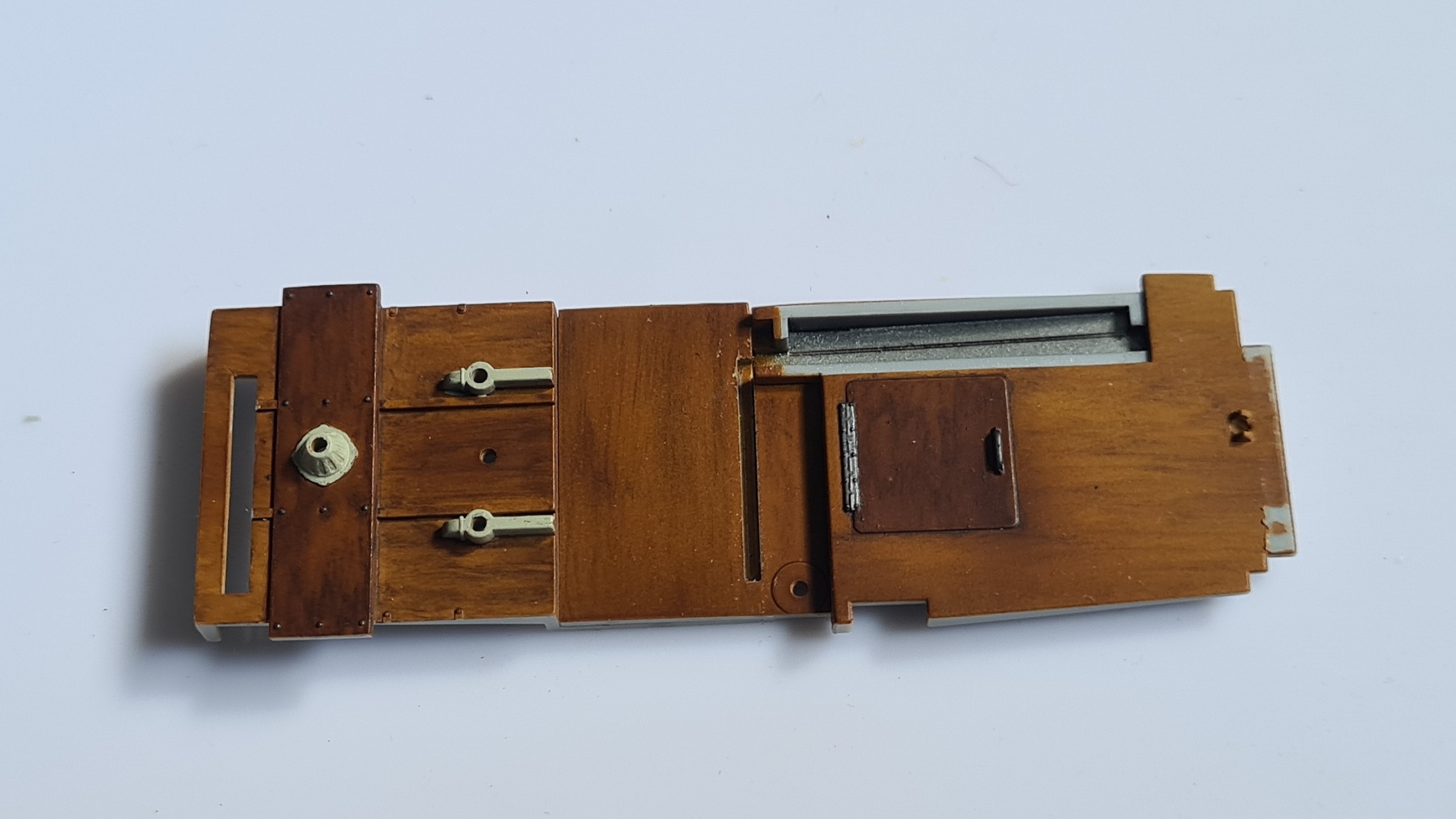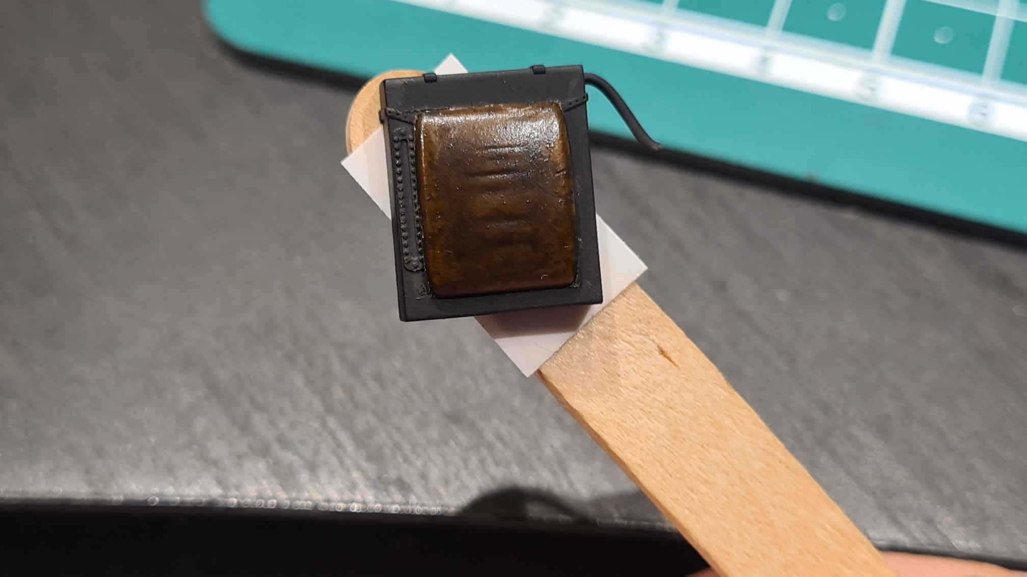 Nach dem Trocknen wurde mit dunkelbraunem Klarlack übersprüht. Mischungsverhältnis etwa 6 Teile Clear Orange / 3 Teile Clear Blue / 1 Teil schwarz (Tamiya X1). Der Glanz wurde anschließend mit einer Schicht Klarlack seidenmatt genommen.