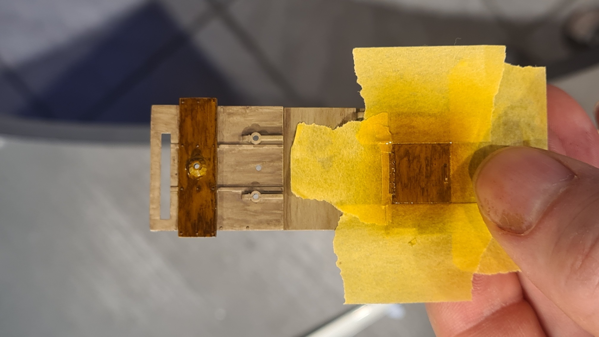 Stellen, die dunkler werden sollen, haben 2 Schichten Lack bekommen, dazu den Rest natürlich abkleben: