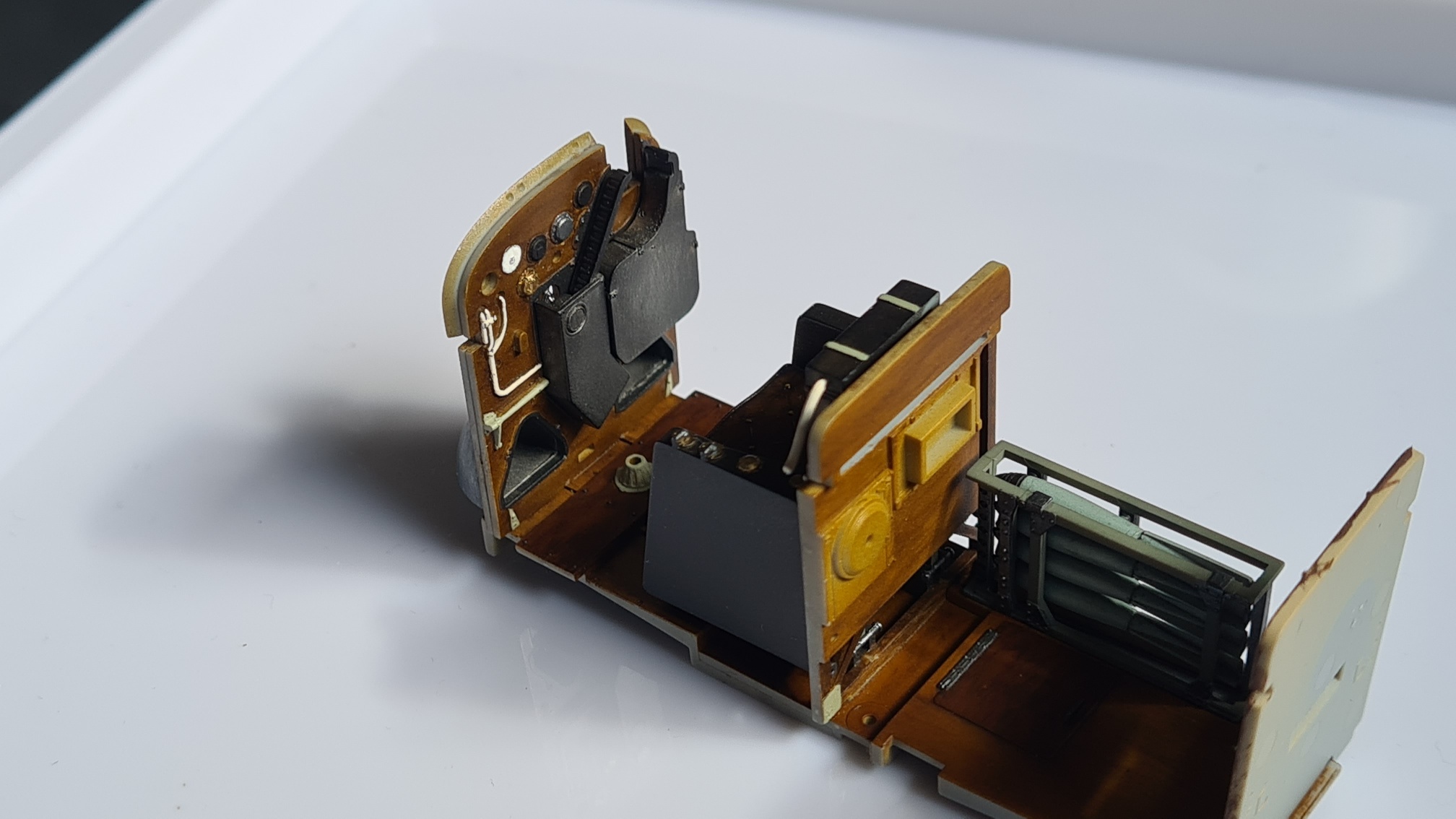 Hier die Cockpit-Instrumente, alle noch ohne Decals und Finish. Startermagnet, Schmierölpumpe, Ventilhebel usw fehlen noch. Die beiden vorstehenden Teile enthalten den Munitionsgürtel, auf der einen Seite gefüllt, auf der anderen Seite leer. Schwarz gestrichen und dann trocken mit Alu gebürstet.