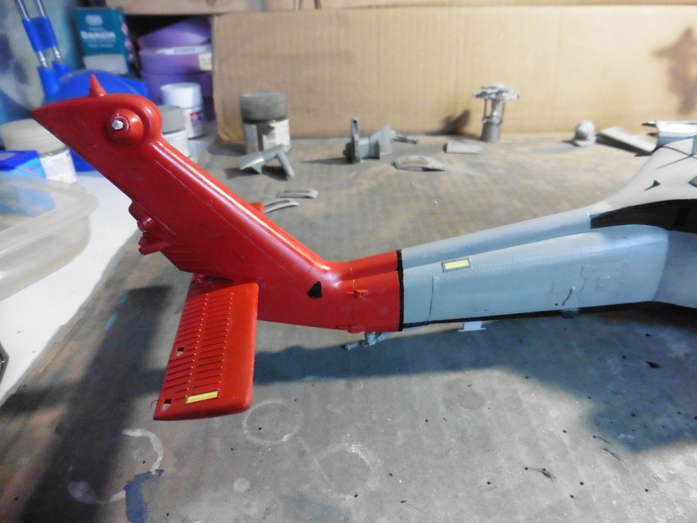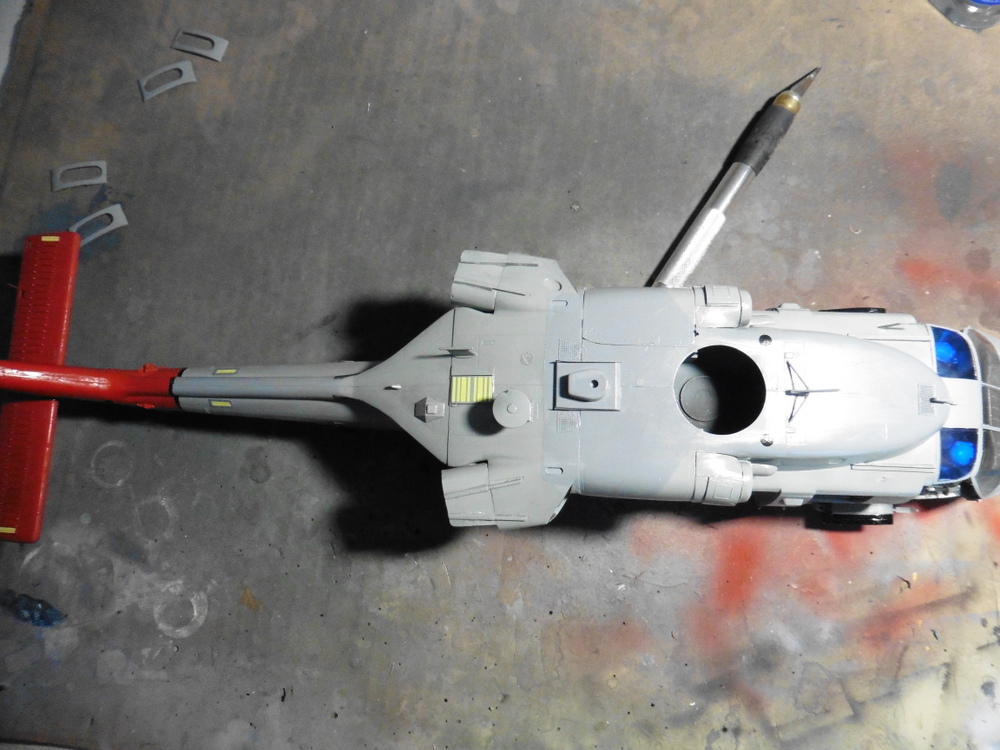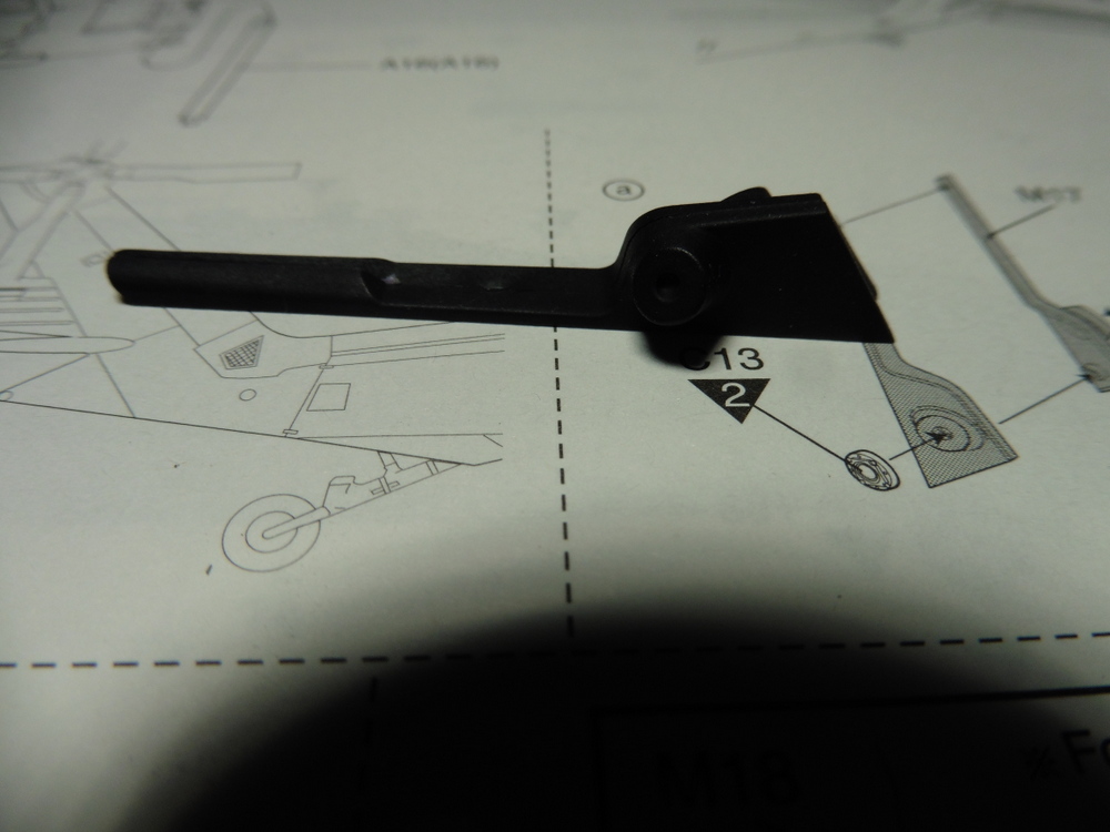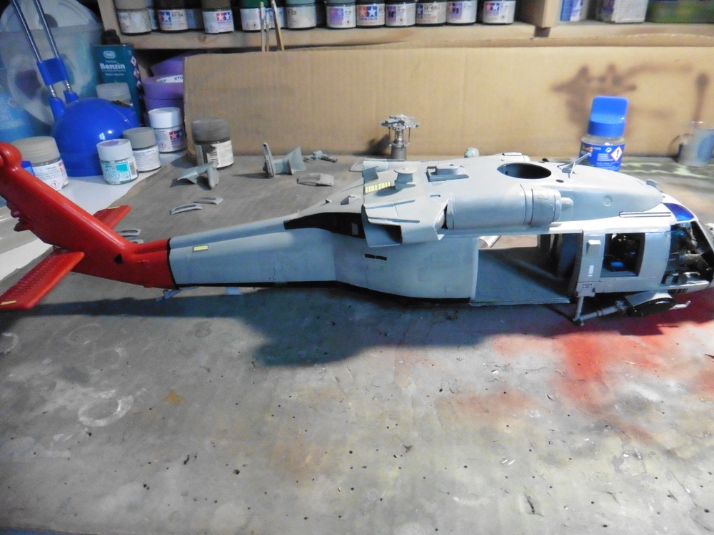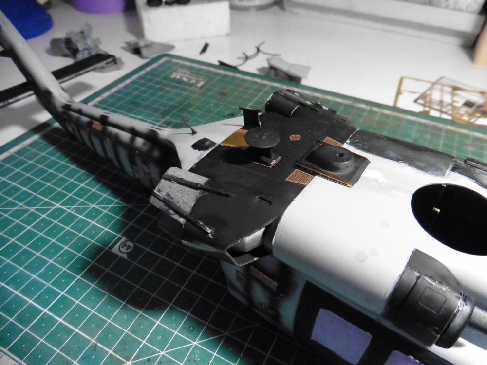 Im großen und ganzen mussten nun alle Anbauteile an den Heli . Die Anleitung gönnt sich den Spass und meint , das man den halben Heckflügel wegschnitzen soll. Gelesen , getan