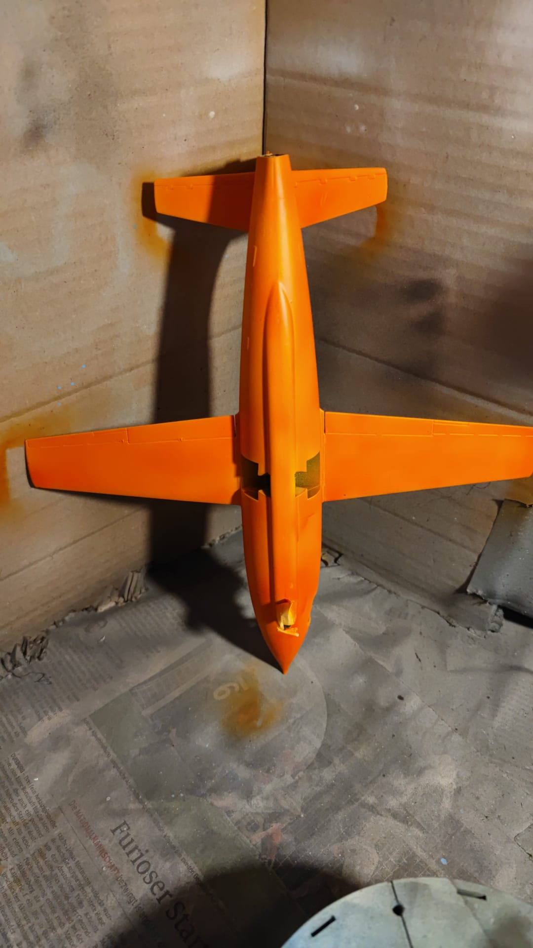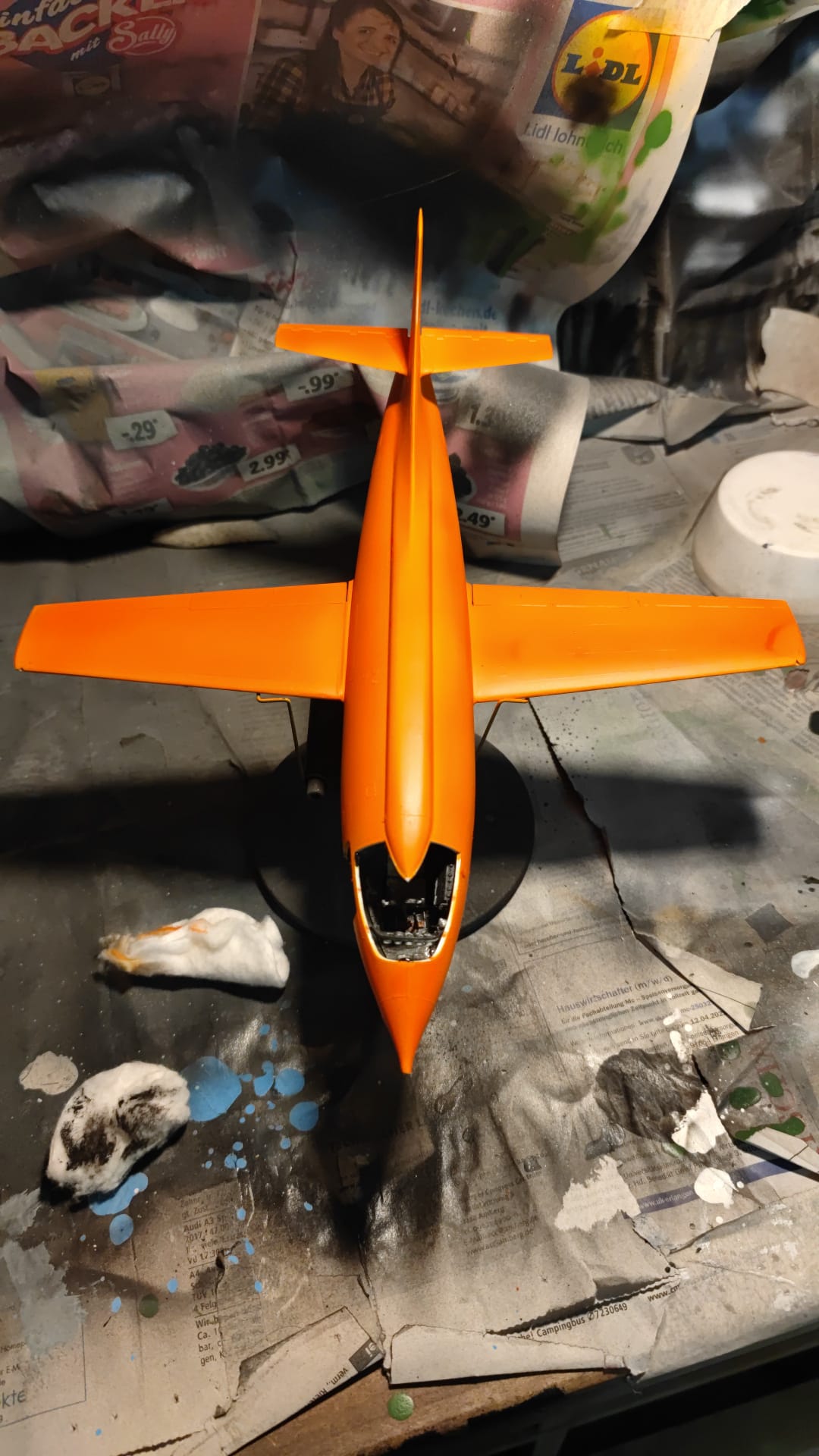Das Orange ist eine verdammt zickige Farbe. Überall gibt es hellere und dunklere Stellen. Die Luke habe ich mit dem Pinsel gemalt und sieht total anders aus.